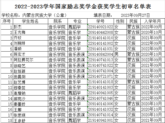 音乐学院根据《内蒙古民族大学国家励志奖学金评审办法》及本年度贫困生入库人员基本情况开展评审工作,并严格坚持“公开、公平、公正、择优”的原则组织开展完成了本年度国家励志奖学金评审工作,经各班推荐提交名单,学院领导班子研究讨论,现将2023年国家励志奖学金入围人选名单公示如下。如有疑问请拨打0475-8314375。公示时间:2023年9月27日—10月10日。