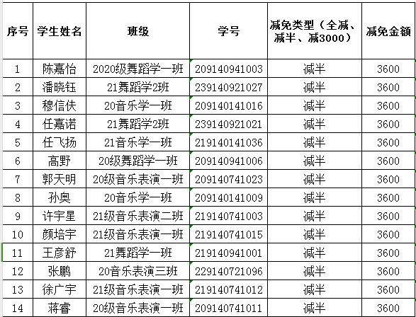 根据校学发〔2023〕25号《关于做好2023—2024学年度家庭经济困难学生减免学费的通知》文件精神,根据学生申报情况,结合学院实际,音乐学院已完成2023年学费减免申请审核工作,现公示如下: