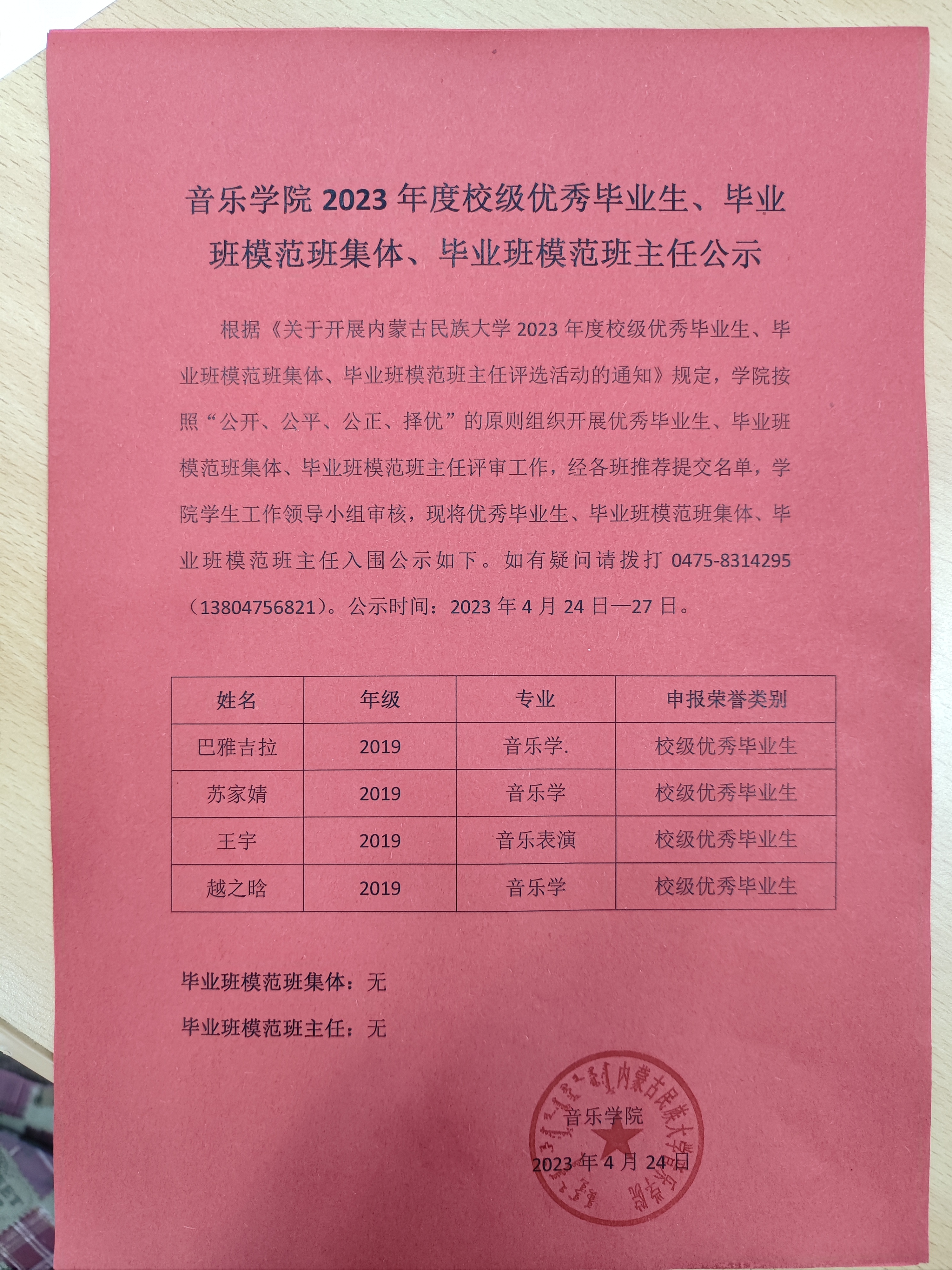 音乐学院2023年度校级优秀毕业生公示