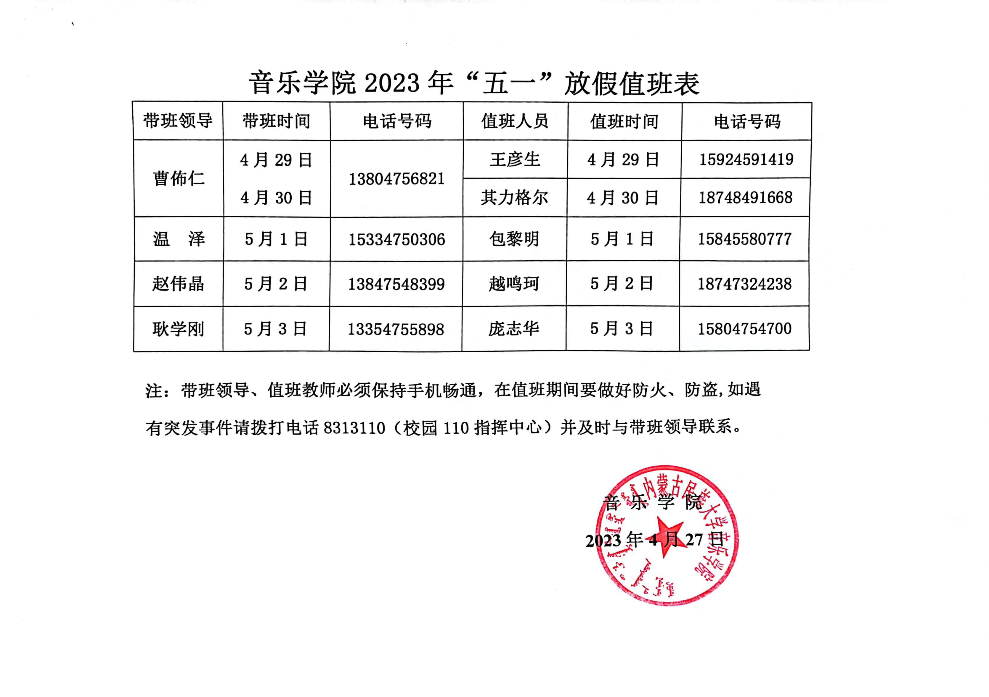 音乐学院五一假期值班表