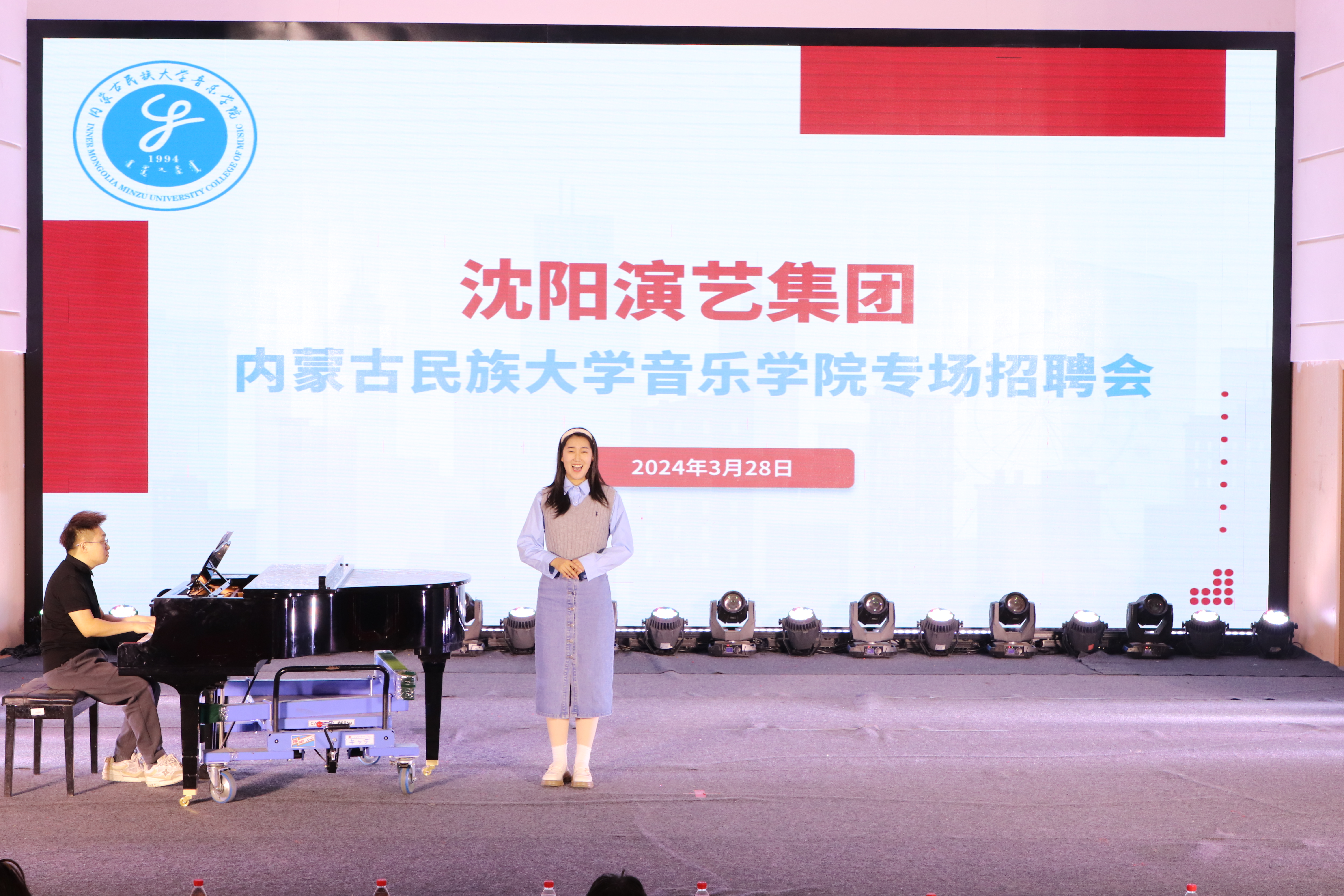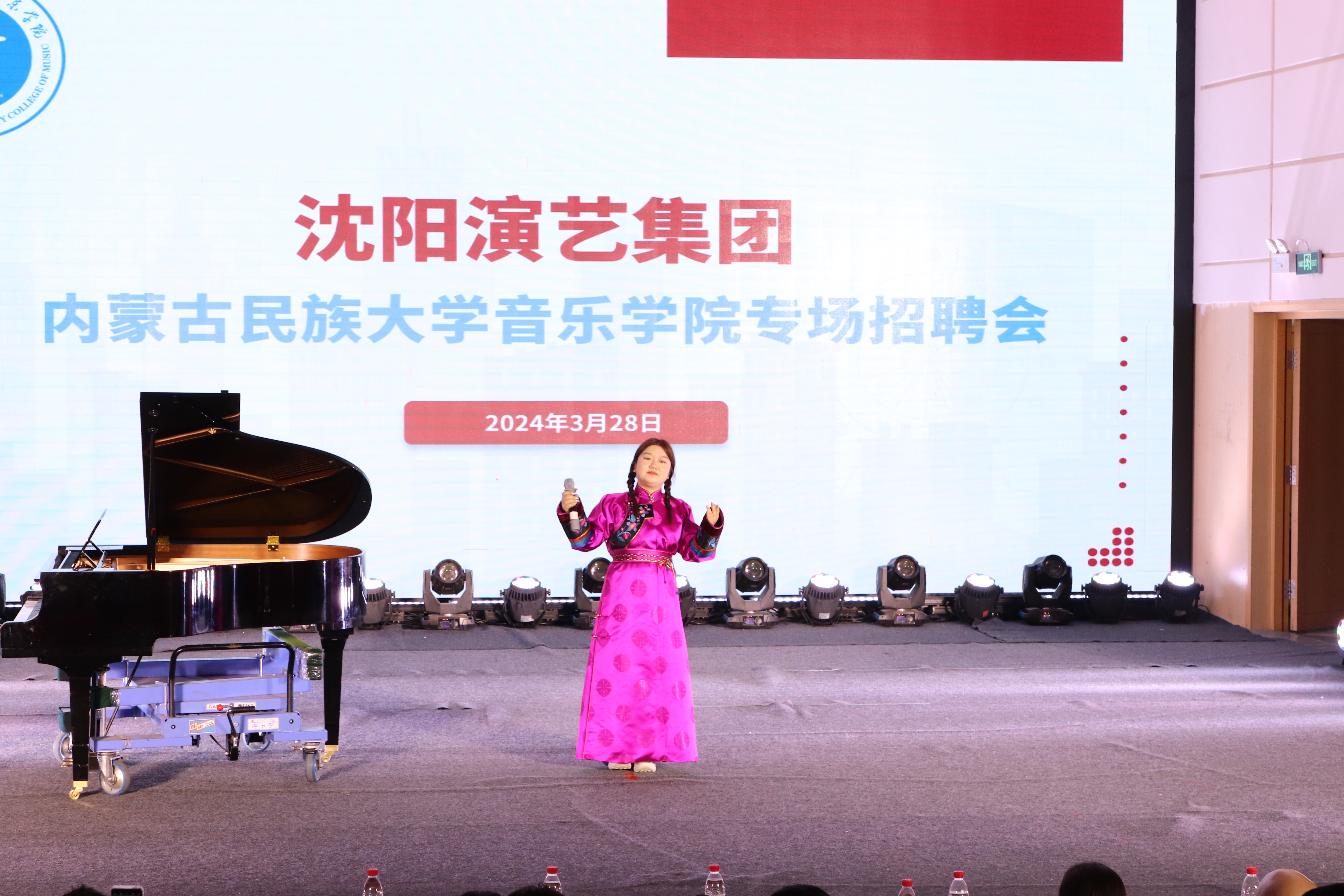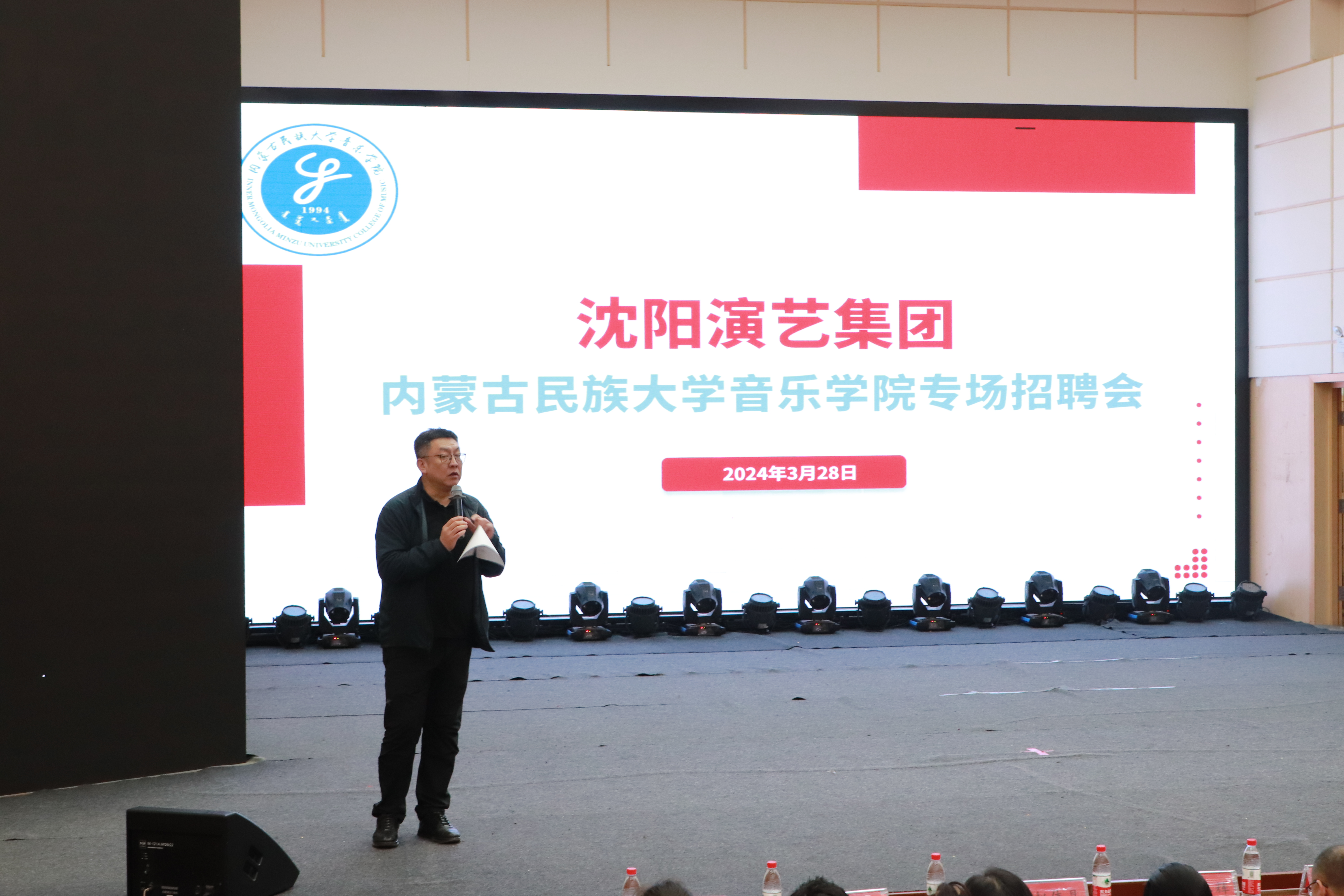 3月28日下午,内蒙古民族大学音乐学院在逸夫楼音乐厅召开沈阳演艺集团专场招聘会,学校党委委员、副校长、统战部部长王百涛、就业处处长王志辉,沈阳演艺集团副总经理穆凯、李媚、沈阳歌舞团舞蹈团团长田孝宇、全体音乐学院党委成员、各教研室主任出席本次活动,音乐学院200余师生参加本次招聘会。会议由音乐学院党委副书记董辉主持。