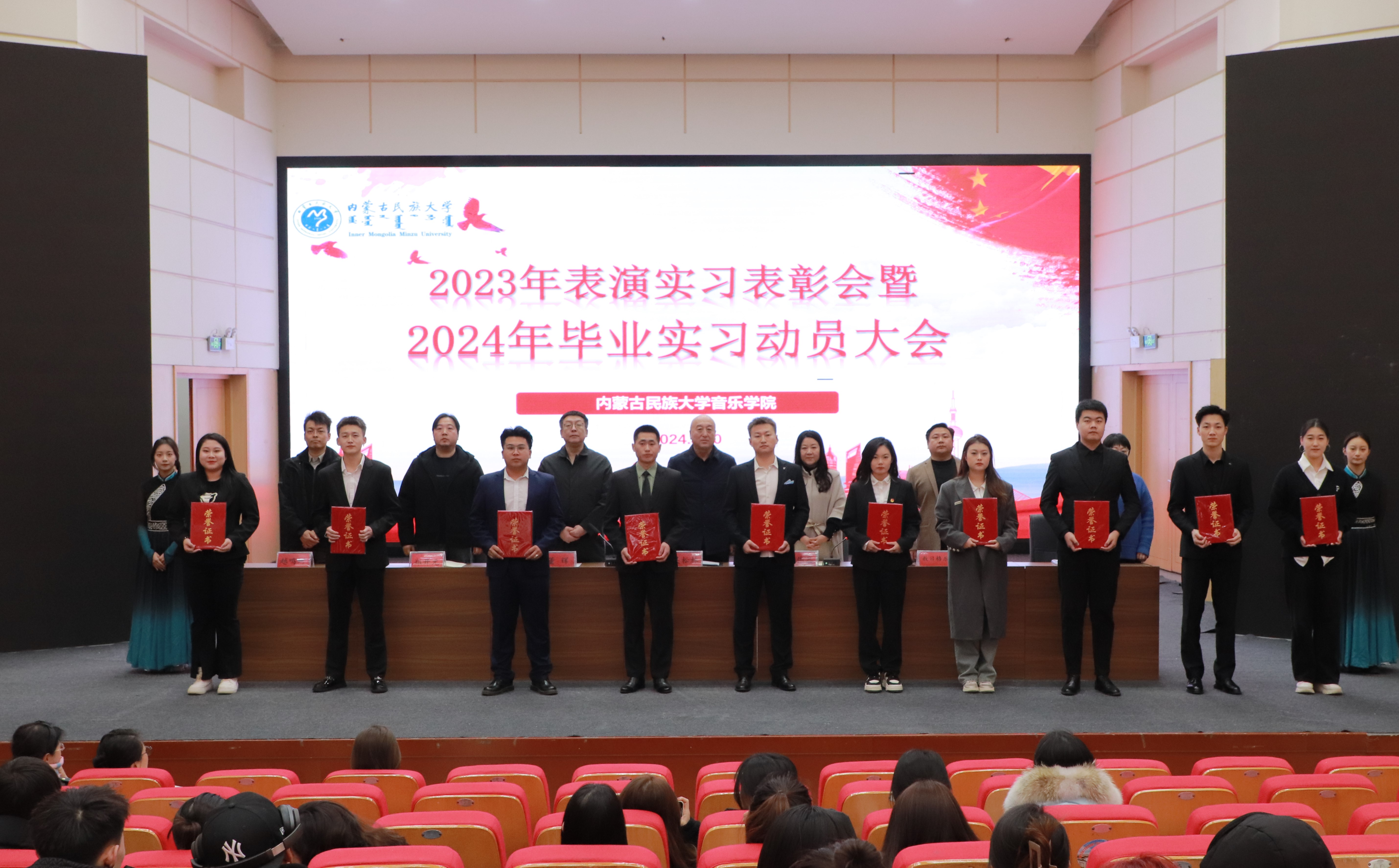 为确保教育实习工作顺利开展,帮助学生做好实习前的各项准备,音乐学院于2024年3月10日上午召开2023年表演实习表彰会暨2024年毕业实习动员大会。学院党委书记吴松林、党委副书记董辉、院长赵伟晶、副院长敖日格乐,以及各位实习带队老师出席本次会议,所有参与2024年实习的学生参加会议。本次会议由音乐学院副院长敖日格乐主持。
