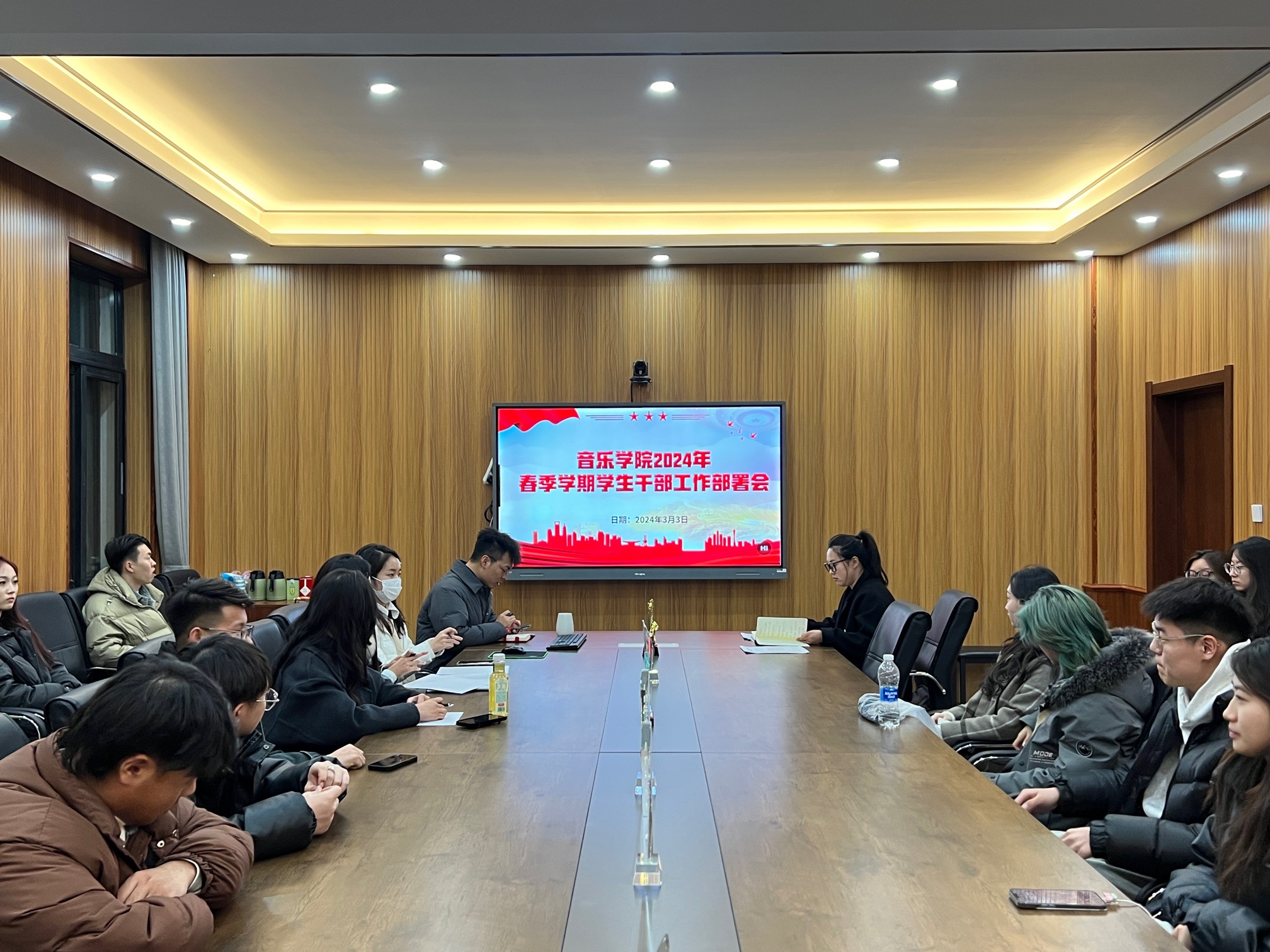 新学期,新征程。为了部署新学期重点工作,贯彻落实新学期学生工作要求,做到超前谋划、认真部署、仔细分工、明确责任。音乐学院于2024年3月3日下午在逸夫楼会议室开展2024年春季学期学生干部工作部署会,会议由学工办主任越鸣珂、团总支负责人陈琢主持,各年级学生干部参加本次会议。