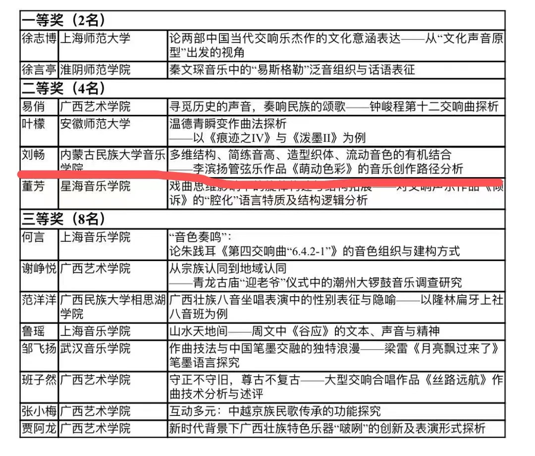 音乐学院音乐理论与音乐教育教研室青年教师,刘畅博士的学术论文《多维结构、简练音高、造型织体、流动音色的有机结合——李滨扬管弦乐作品《萌动色彩》的音乐创作路径分析》,在此次评选中荣获“作曲技术理论、音乐史学、民族音乐学、音乐美学综合类文章”二等奖。