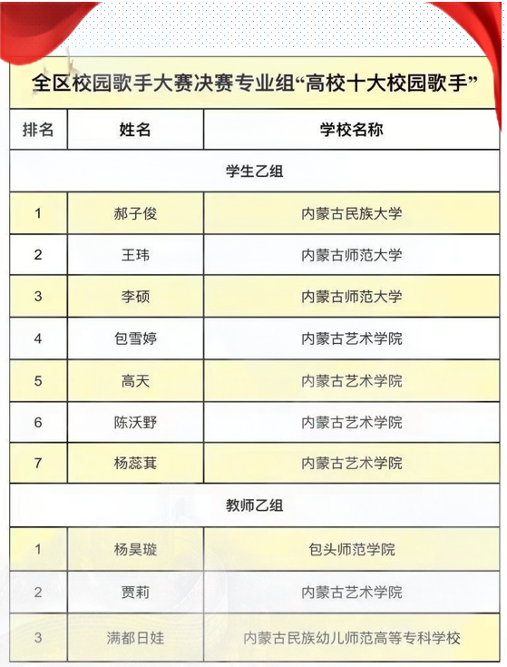 今年九月大赛启动以来,经过校级初赛、自治区复赛以及线上观众投票等层层选拔与评审,最终从来自全区48所高校上报的516份作品中选出40名选手进入决赛。经过激烈的角逐,我院选送的郝子俊同学以98.02分的好成绩获得学生乙组第一名,获得本次“高校十大校园歌手”荣誉称号,我校获得优秀组织奖。