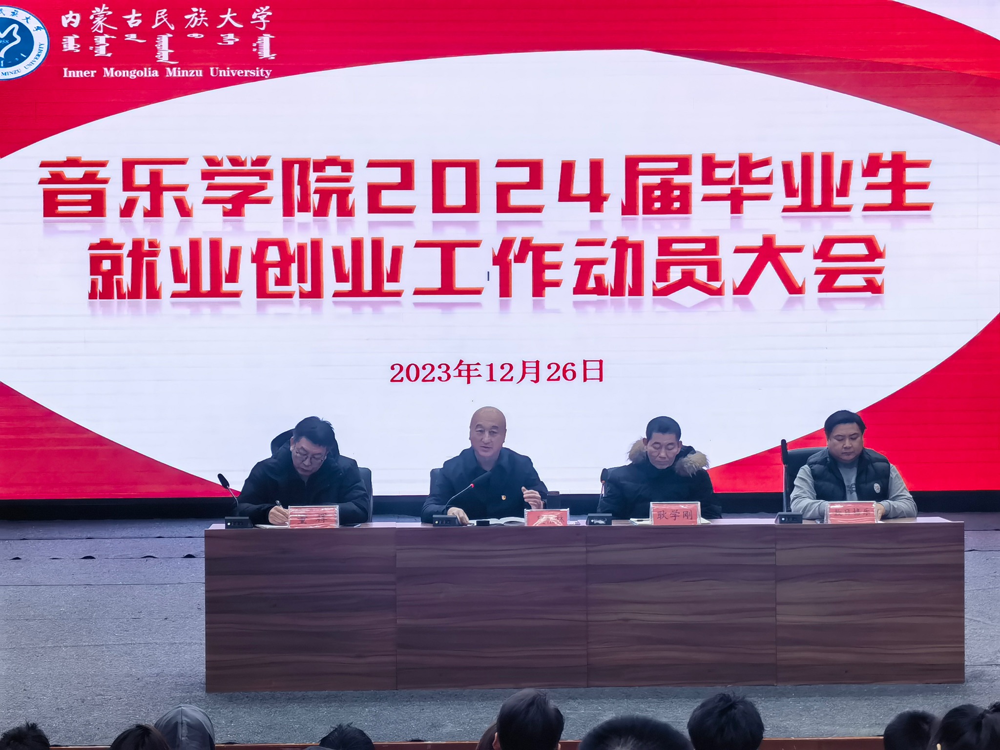 为进一步深入贯彻落实党中央“稳就业”“保就业”的重要工作部署,帮助2024届毕业生深刻认识到当前的就业形势与就业压力,培养其主动就业意识,及早把握就业机会,提高就业技能,音乐学院于2023年12月26日在逸夫楼音乐厅于召开2024届毕业生就业创业工作动员大会。音乐学院党委书记吴松林,副院长(主持工作)耿学刚、党委副书记董辉、副院长敖日格乐和全体2024届毕业生参加本次大会。