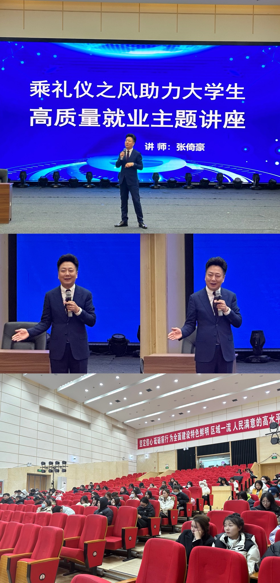 张老师分别从引导礼仪、握手礼仪、颁奖礼仪、面试礼仪等几个方面对同学们做了详细的理论讲解和实践指导,良好的礼仪形象包括仪容、仪表、仪态、仪礼、仪谏,诠释了形象礼仪在求职面试中的重要性。在讲座上,张老师对同学们的疑问进行了耐心解答,他提醒同学们平时要注重职业礼仪知识的学习和积累,自觉努力提升自身的礼仪修养和职业素质,为今后就业创业打下坚实的基础。
