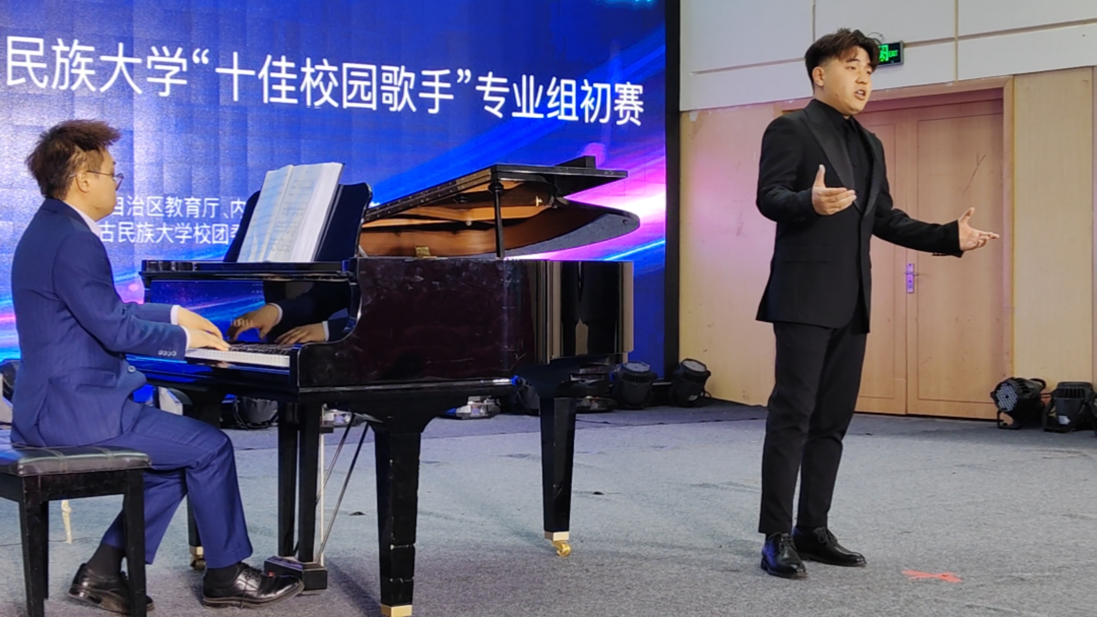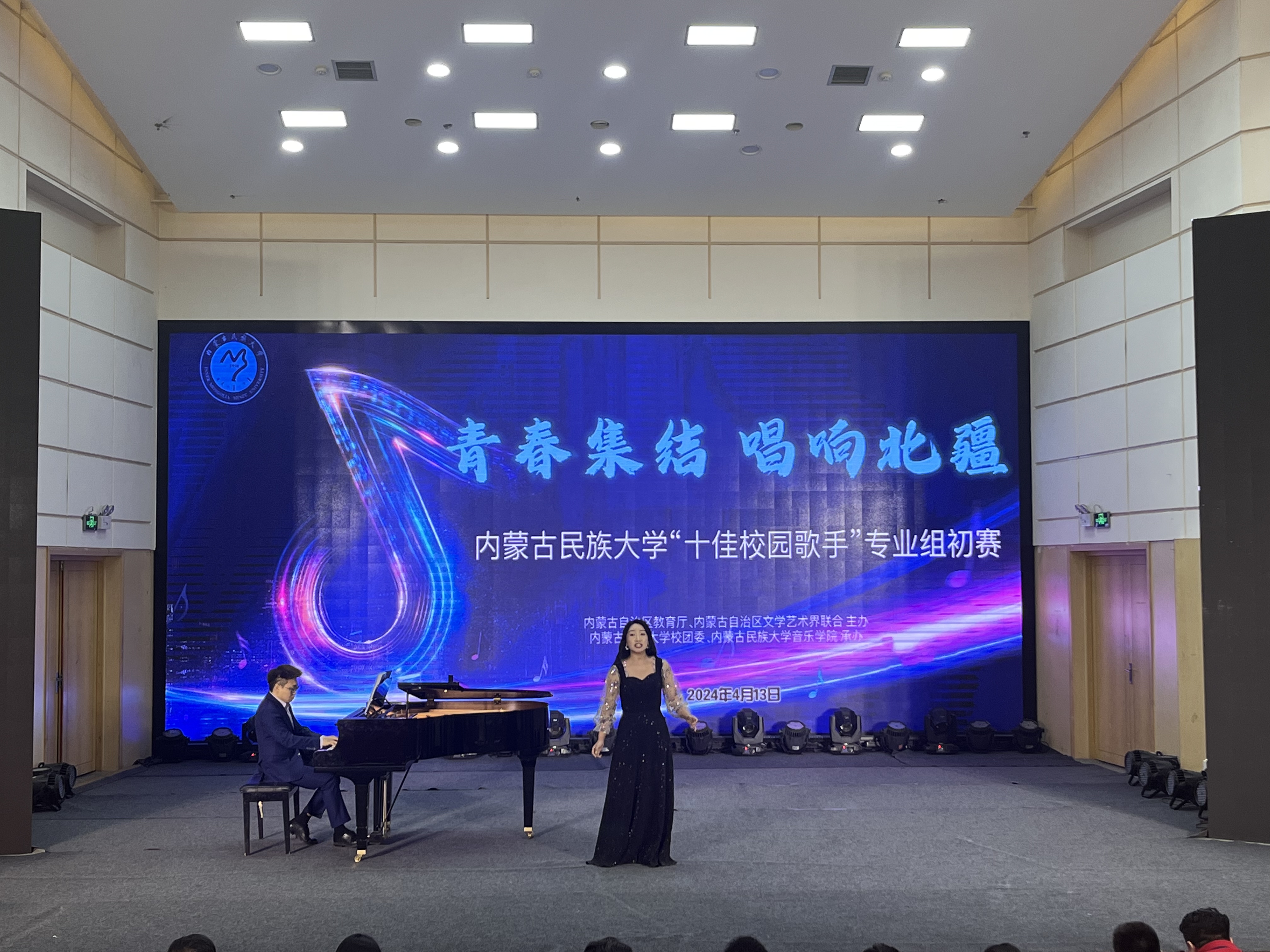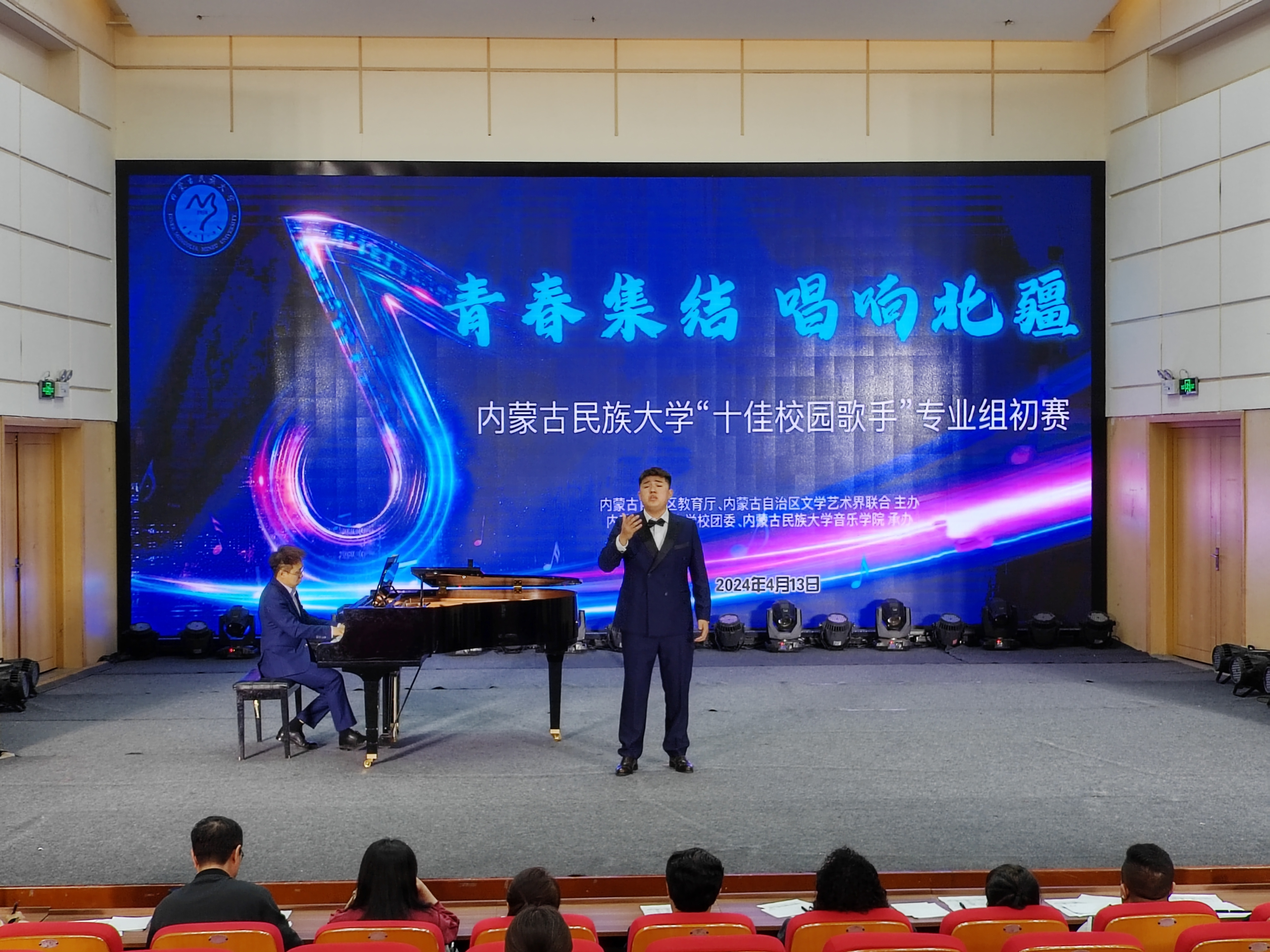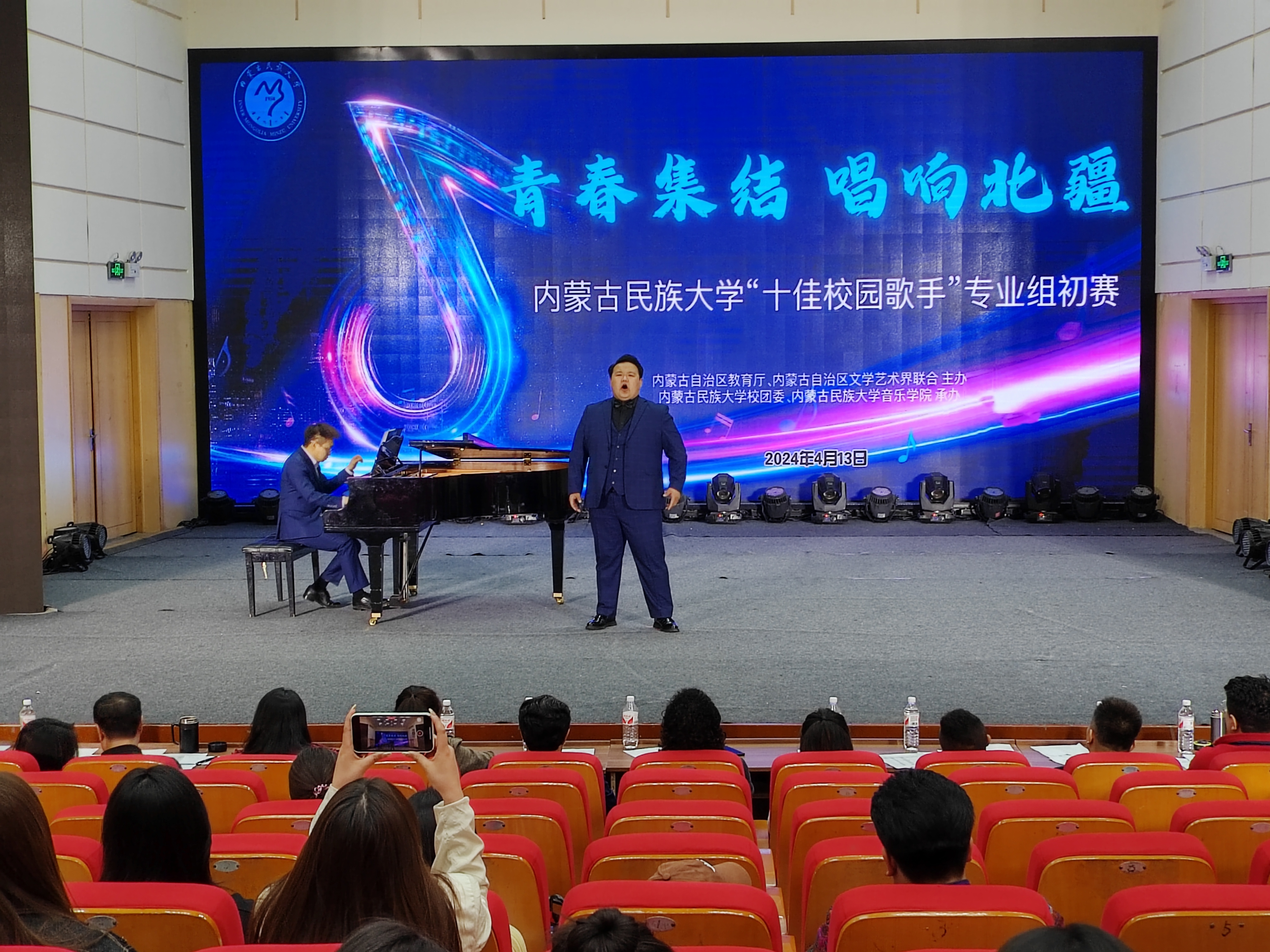 4月13日晚,内蒙古民族大学“十佳校园歌手”专业组选拔赛初赛在音乐学院音乐厅举办。此次比赛由内蒙古自治区教育厅、内蒙古自治区文学艺术界联合主办,内蒙古民族大学校团委、内蒙古民族大学音乐学院协办。大赛以“青春集结 唱响北疆”为主题,紧紧围绕铸牢中华民族共同体意识这条主线,弘扬中华优秀传统文化和中华美育精神,坚定文化自信,陶冶人文情怀。