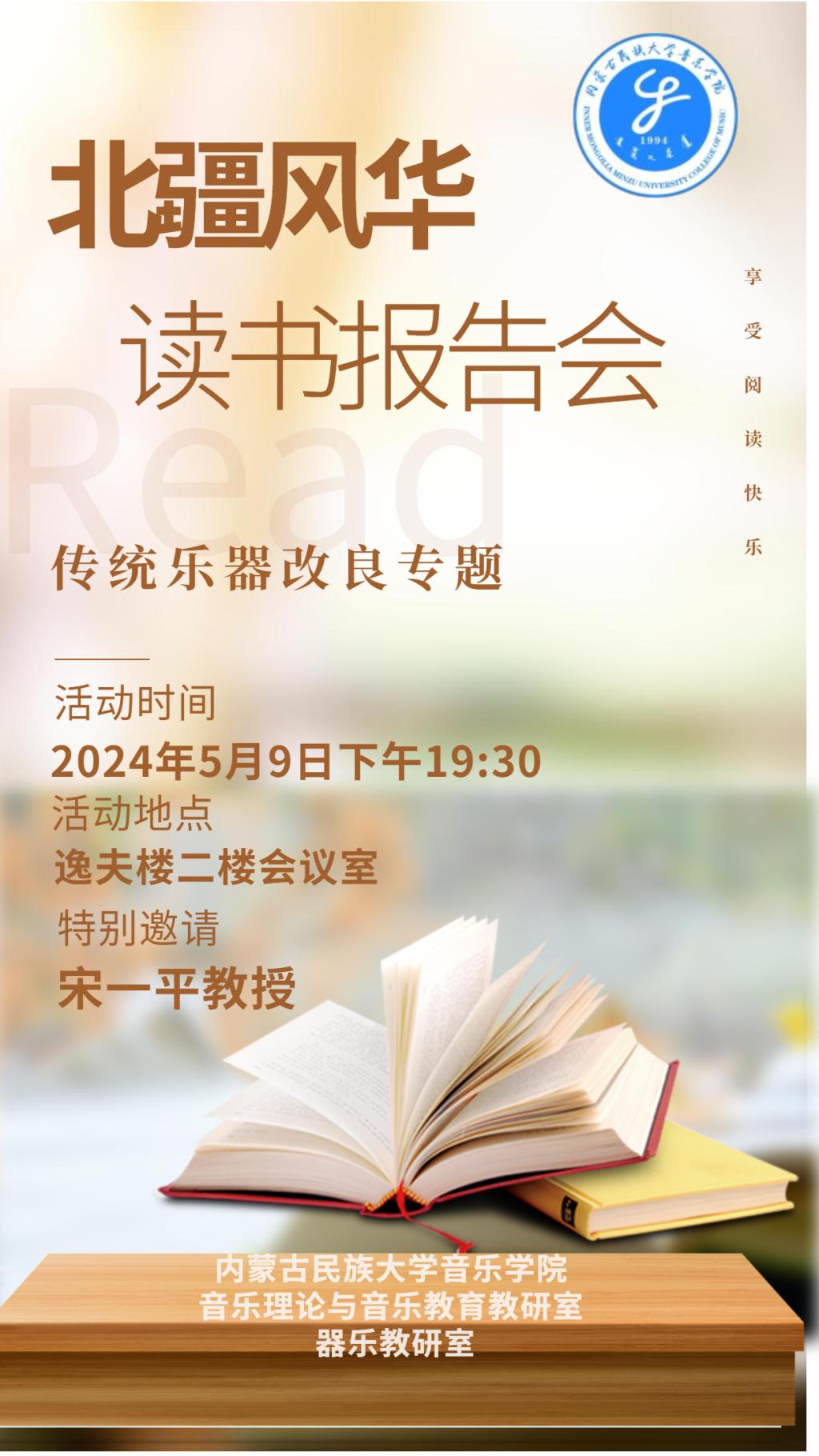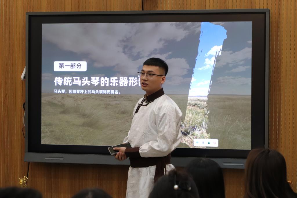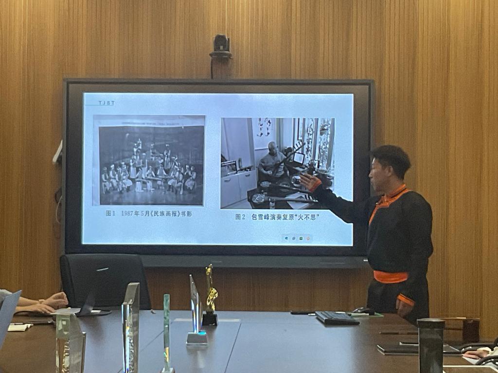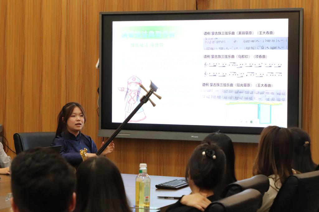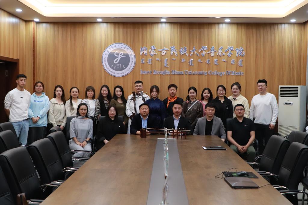 2023年5月9日19:30,音乐学院音乐理论与音乐教育教研室、器乐教研室联合举办“北疆风华”系列读书报告会第1期。本次报告会汇报者为2021级、2022级张政、海日、宝璐尔等3位本科生。我院特聘教授宋一平博士、副院长敖日格乐、音乐理论与音乐教育教研室主任石垚、器乐教研室主任苏雅汗、刘畅副教授,以及陈晓芳、白珍妮、李吉星等教师出席本次读书报告会并进行指导,青年教师杨屹博士主持本次读书报告会。