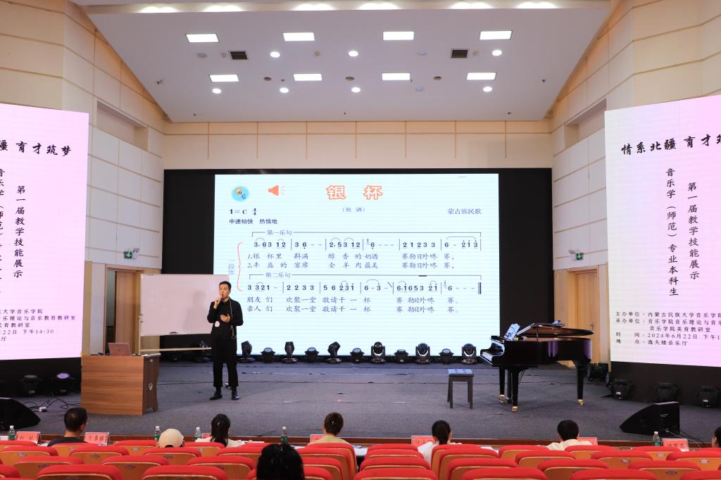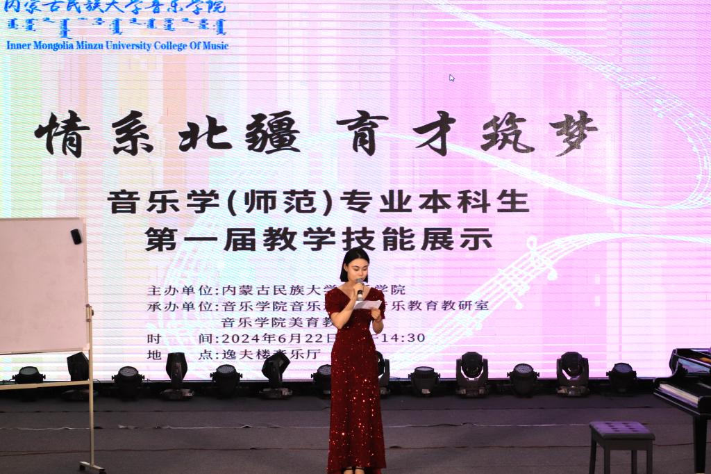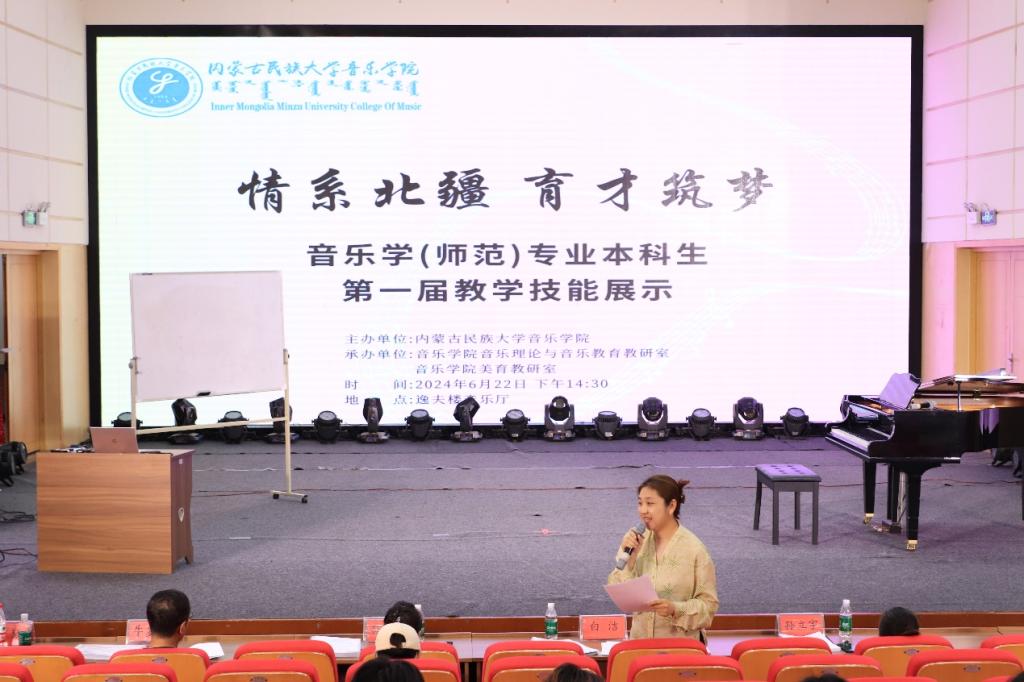 为深入贯彻习近平总书记关于美育的重要论述,巩固音乐学(师范)专业认证成果,推动我院教育教学改革、提高师范生培养质量,提升师范生教学能力,2024年6月22日14:30音乐学院于音乐厅举办“情系北疆,育才筑梦”——音乐学(师范)专业本科生第一届教学技能展示大赛。音乐学院院长赵伟晶,副院长敖日格乐,音乐学系主任郑开元观看了本次比赛,本次比赛还另外邀请了基础教育一线的三位优秀教师担任评委。