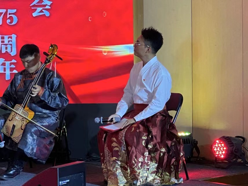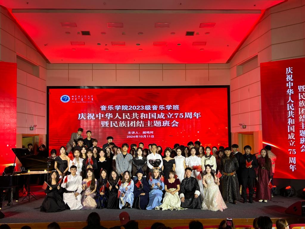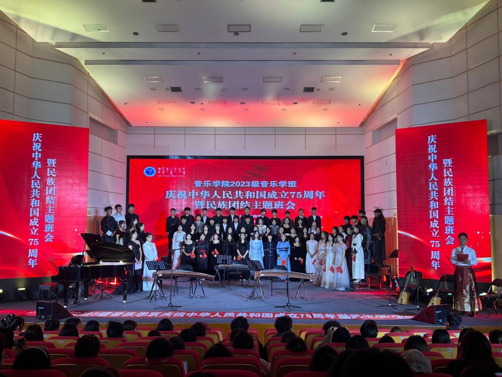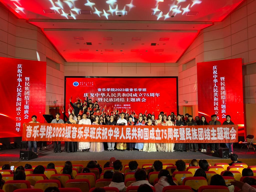为了贯彻落实习近平总书记关于民族团结的指示精神,深入推进铸牢中华民族共同体意识宣传教育,营造民族团结进步的良好氛围,音乐学院2023级音乐学班于2024年10月12日在逸夫楼音乐厅开展庆祝中华人民共和国成立75周年暨民族团结主题班会,本次班会由班主任越鸣珂主持。