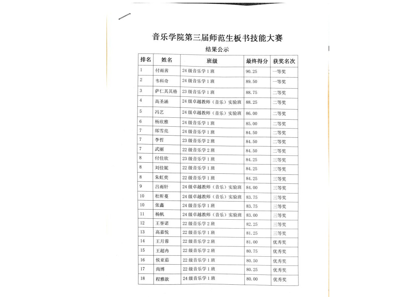 为全面贯彻国家语言文字方针政策和法律法规,贯彻落实习近平总书记关于做好推广普及国家通用语言文字工作的重要指示精神,提升音乐学院师范生板书书写及设计水平,加强师范类专业人才培养质量,音乐学院于2024年10月30日在逸夫楼503教室组织开展第三届师范生板书大赛,共42名同学报名参加。