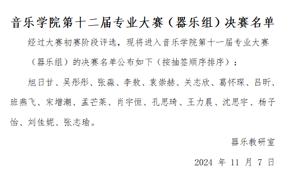 为庆祝中华人民共和国成立75周年,进一步推动我校高等教育高质量发展,落实立德树人根本任务,切实提高学生专业技能水平和舞台实践能力不断提升,营造积极向上的校园文化氛围,彰显时代精神,激发青春活力。11月8日“唱响民大,舞动青春”——音乐学院第十二届专业大赛(器乐组)初赛在逸夫楼排练厅隆重开赛。此次大赛(器乐组)共计报名40余人,包含西洋管弦乐、民族器乐等15种乐器门类。经过选手们的激烈角逐,最终评选出18位优胜者进入决赛。决赛暂定12月初进行,让我们继续关注他们的精彩表现吧!