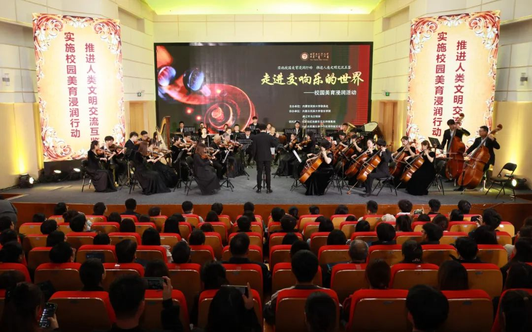 奏响青春旋律,共谱美育华章。11月12日晚,我校校园美育浸润系列活动——“走进交响乐的世界”音乐会在西拉木伦校区逸夫楼音乐厅拉开帷幕。校党委书记赵东海,校党委委员、副校长杨恒山,校党委委员、副校长陈英松,校党委委员、副校长裴志利,校党委委员、纪委书记、监察专员国庆,校党委委员、副校长王百涛,副校长红梅,校党委委员、统战部部长张琪出席音乐会现场。各职能部门、教学单位主要负责人以及350余名师生代表共同聆听。