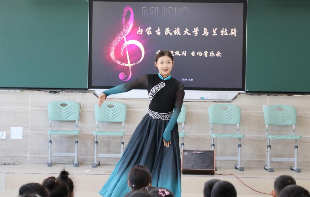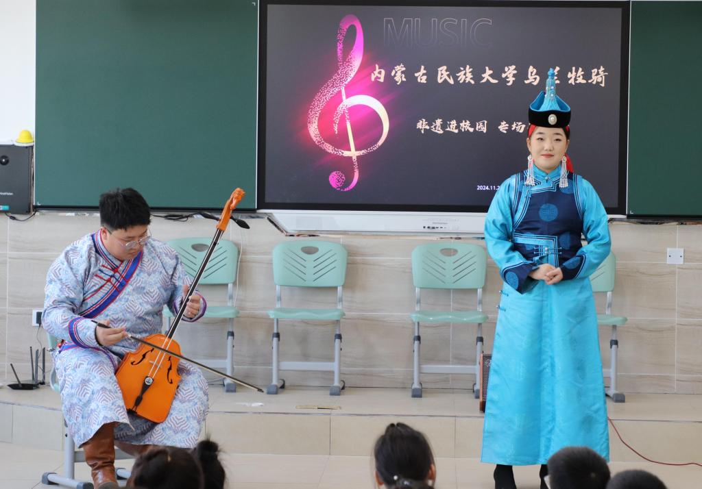 2024年11月21日,为了弘扬和传承非物质文化遗产,让青少年学生近距离感受非遗文化的独特魅力,内蒙古民族大学乌兰牧骑今日走进了通辽市第四中学富力校区小学部,为师生们带来了一场精彩纷呈的文化盛宴。