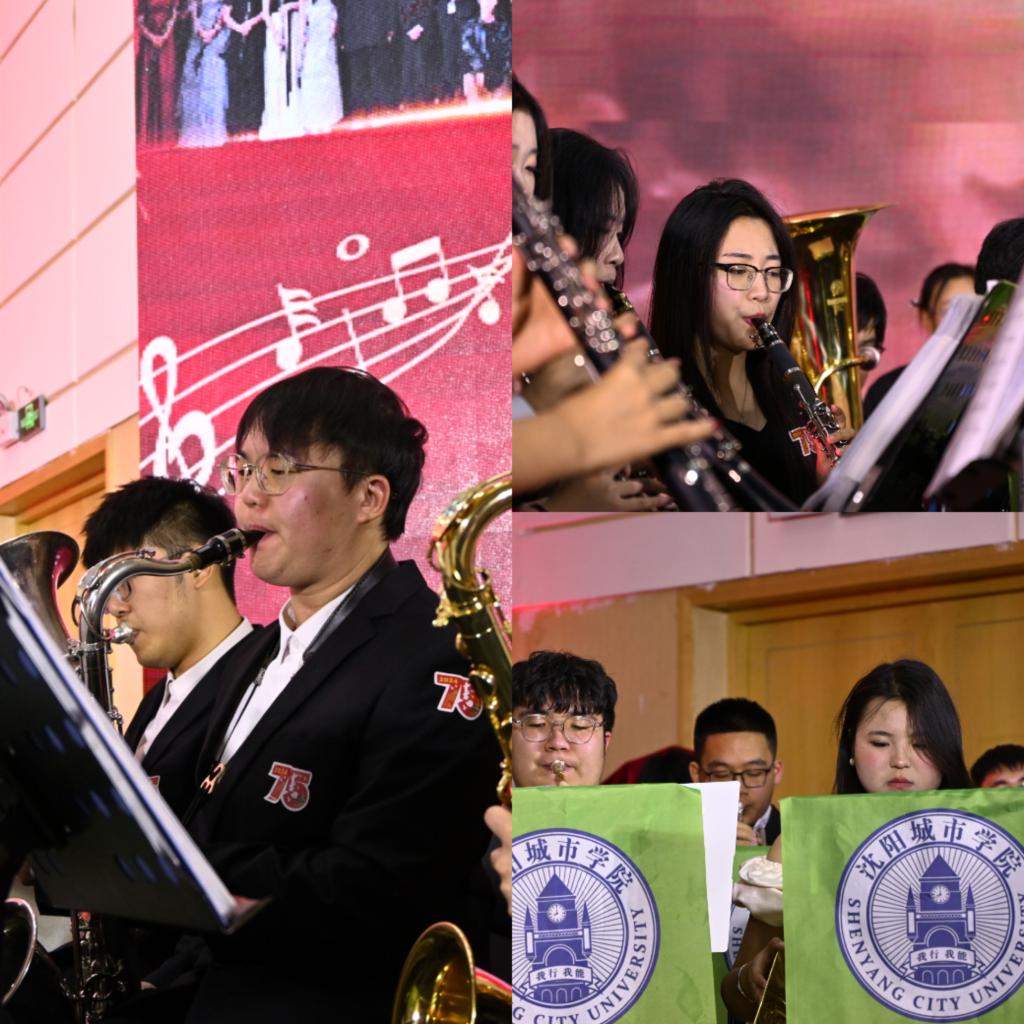 当晚的音乐会沈阳城市学院交响管乐团为观众带来了一次精彩的视听盛宴。音乐会演奏了《东方红》、《红旗颂》、《保卫黄河》、《我的祖国》、《唱支山歌给党听》、《最美中国红》、《我和我的祖国》等16部红色经典交响乐作品,展现了精湛的演奏技巧和深厚的艺术功底。