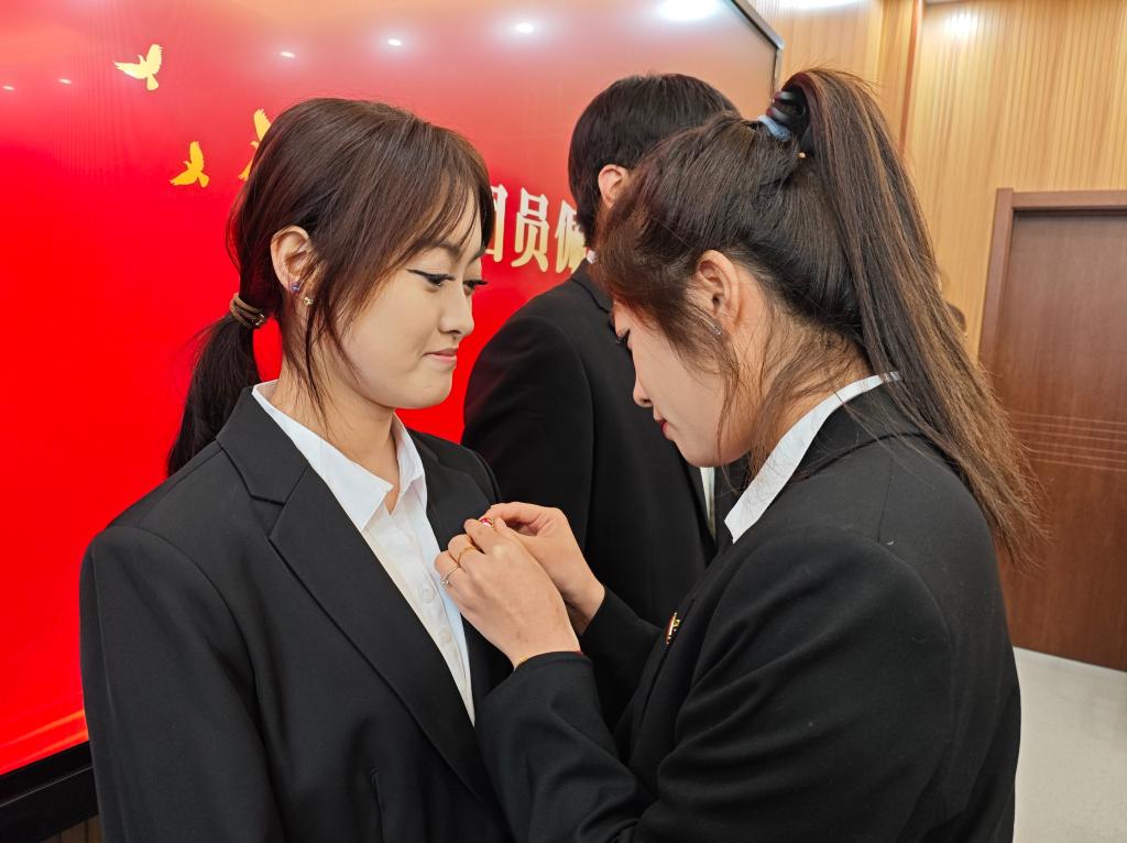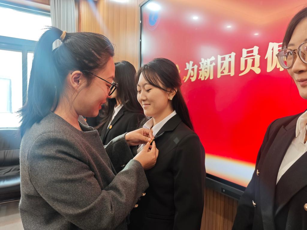 音乐学院团总支负责人陈琢老师宣读了新团员名单,并与团总支副书记刘桐妍共同为新团员佩戴了团徽。这不仅是身份的象征,更是责任与使命的传递,激励着新团员们在未来道路上勇往直前。