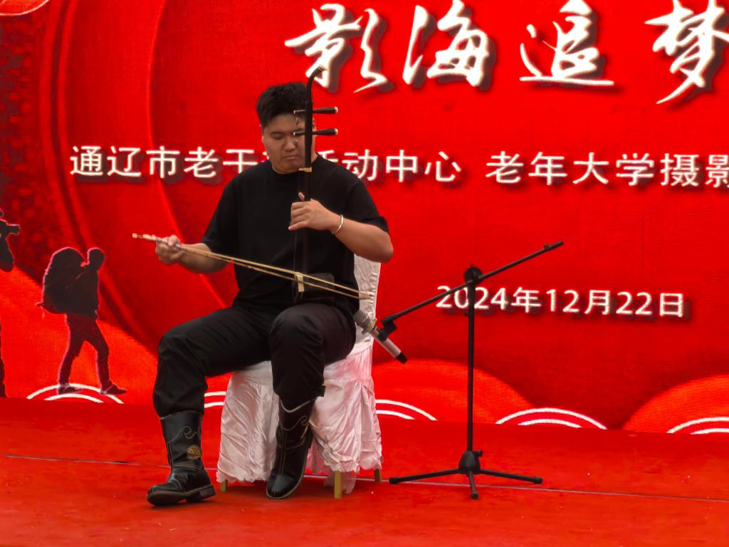 音乐学院乌兰牧骑艺术团的成员们身着民族服饰,精神饱满,准备为老年大学的摄影爱好者们呈现一场视听盛宴。演出在悠扬的马头琴齐奏中拉开序幕,旋律优美,瞬间将观众带入了一个充满民族风情的音乐世界。紧接着,长调、蒙古舞、呼麦组合等节目轮番上演,每一个节目都充满了浓郁的民族特色和艺术魅力。