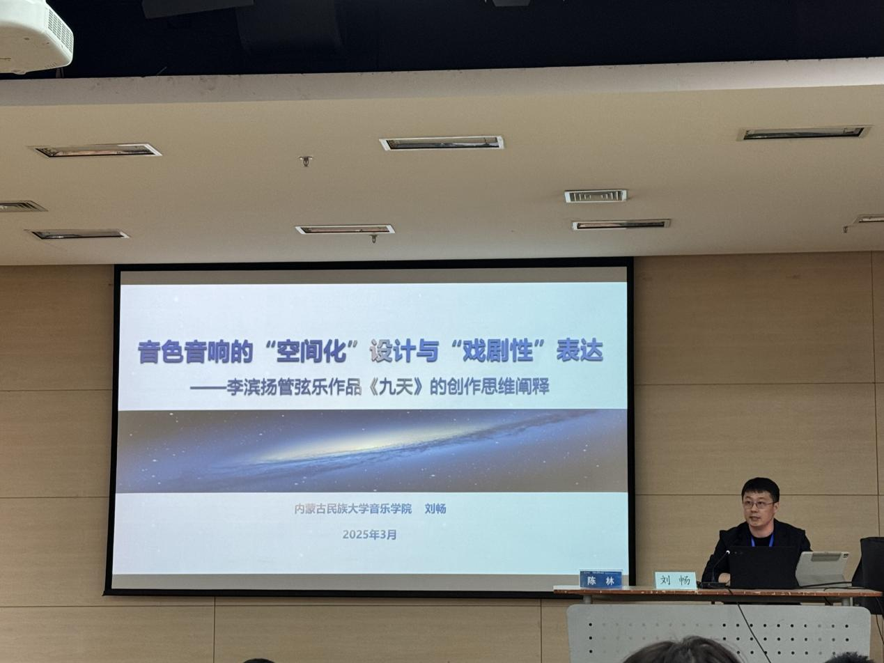本次研讨会自2024年10月15日发布1号公告以来,共收到127篇参会论文。经组委会评选,50篇论文入选会议发言。我院音乐理论与音乐教育教研室教师,刘畅副教授的学术成果入选了本次研讨会,并代表我校在会议上做了题为《音色音响的“空间化”设计与“戏剧性”表达——李滨扬管弦乐作品《九天》的创作思维阐释》的主题发言。