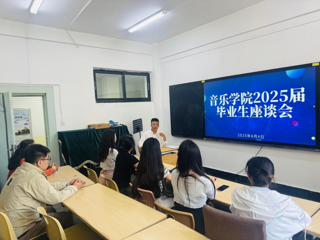 2025年6月4日,音乐学院在学院会议室成功举办了2025届毕业生座谈会。学工办主任越鸣珂、辅导员庞志华以及毕业生代表和在校生代表共同参加了此次座谈会。本次座谈会旨在回顾大学生活,展望未来成长,同时为学院发展建言献策,为在校学弟学妹们提供学习经验与指导。