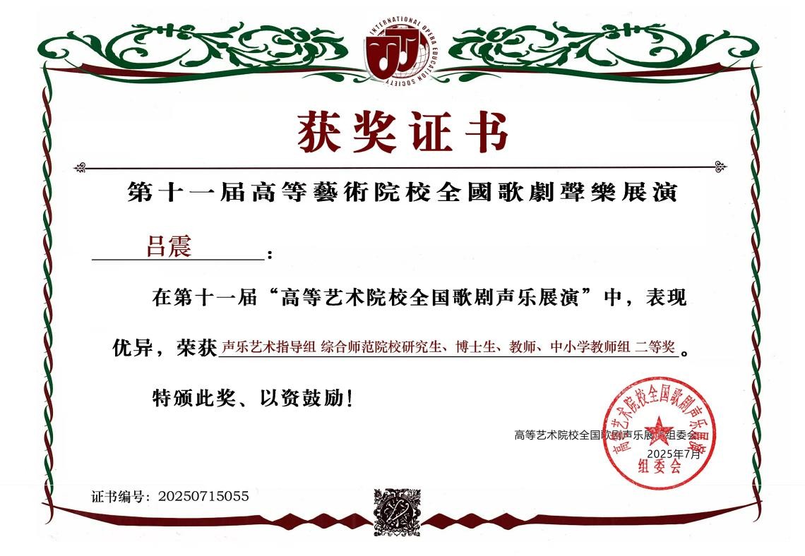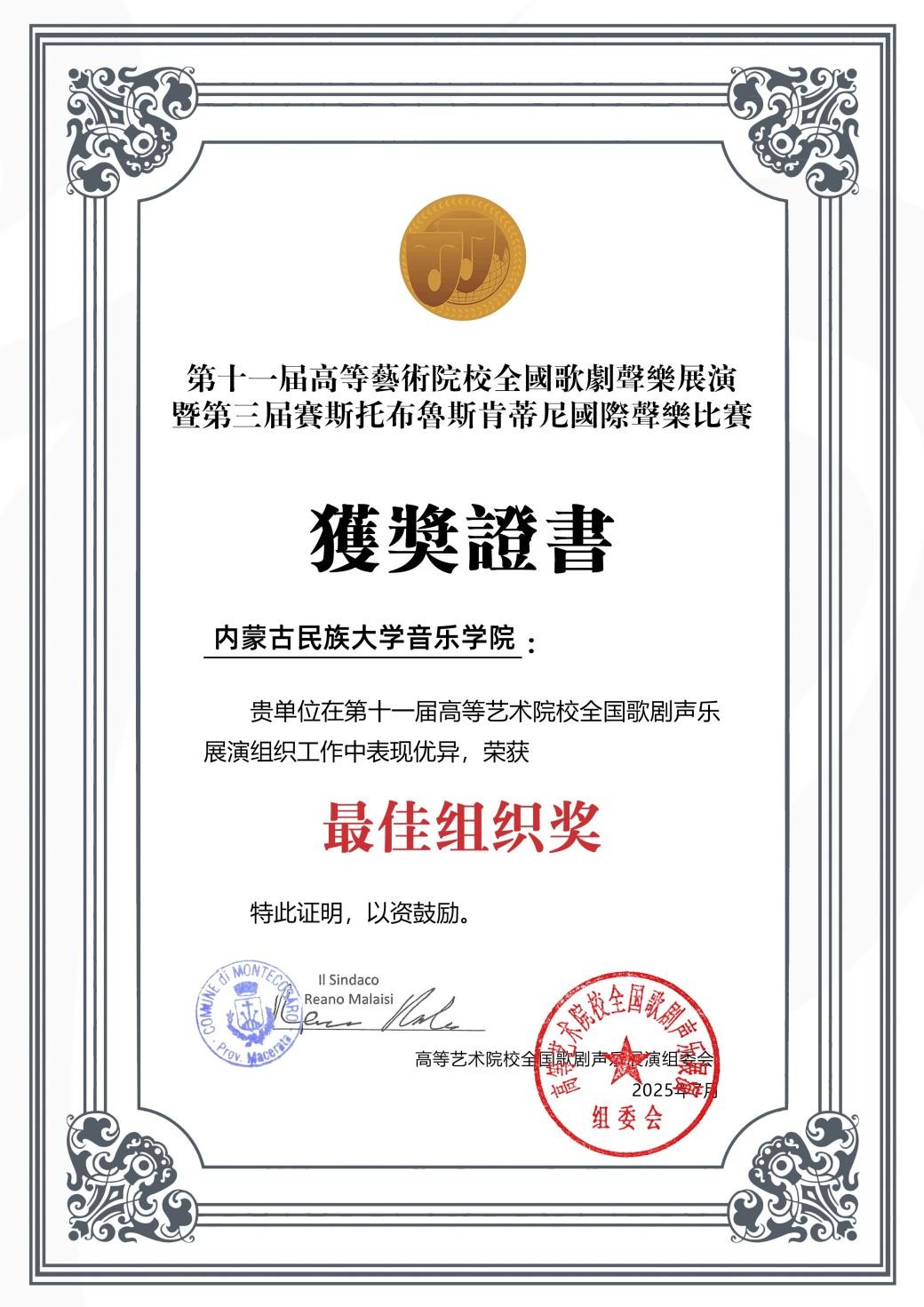 此次歌剧展演我校音乐学院共有四名教师和五名学生分别参加本科、硕士、博士、教师——中国作品组;硕士、博士、教师——外国歌剧咏叹调组及声乐艺术指导组的比赛,经过四天两轮的激烈角逐,我院钢琴专业教师吕震获得“声乐艺术指导组”二等奖,青年教师李留喜、王明旭获得综合师范院校教师组优秀奖;研究生孙文彬、乔哲轩获得综合师范院校硕士研究生组优秀奖;内蒙古民族大学音乐学院获得“最佳组织奖”