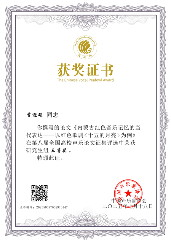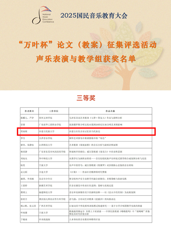 在2025年国民音乐教育大会“万叶杯”论文(教案)征集评选活动中,贾迎硕在声乐表演与教学组中脱颖而出,荣获三等奖。