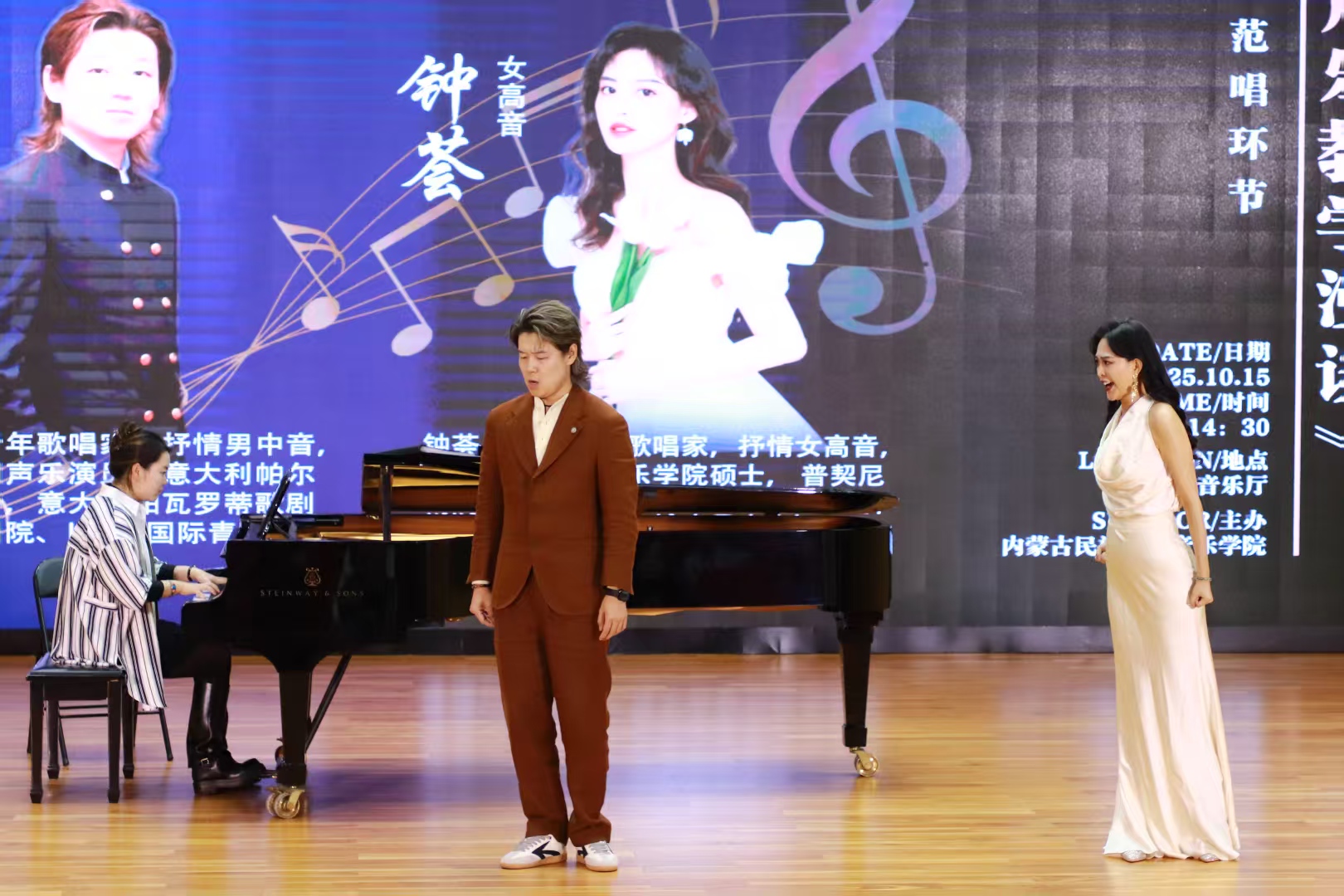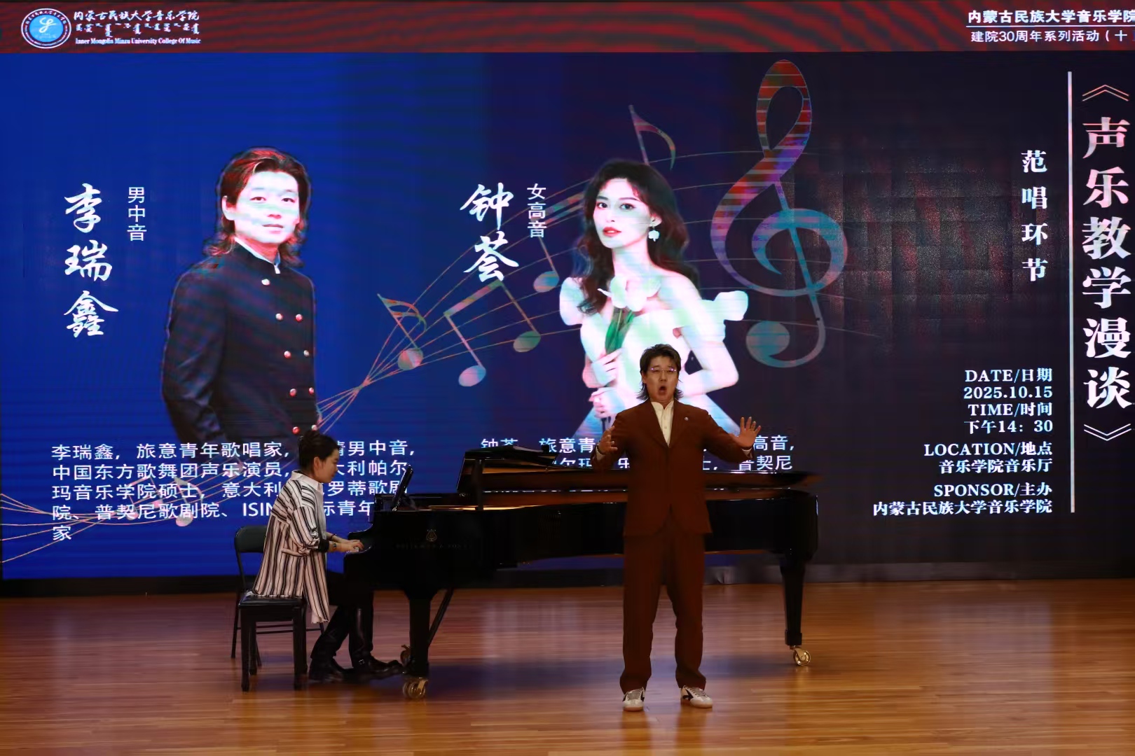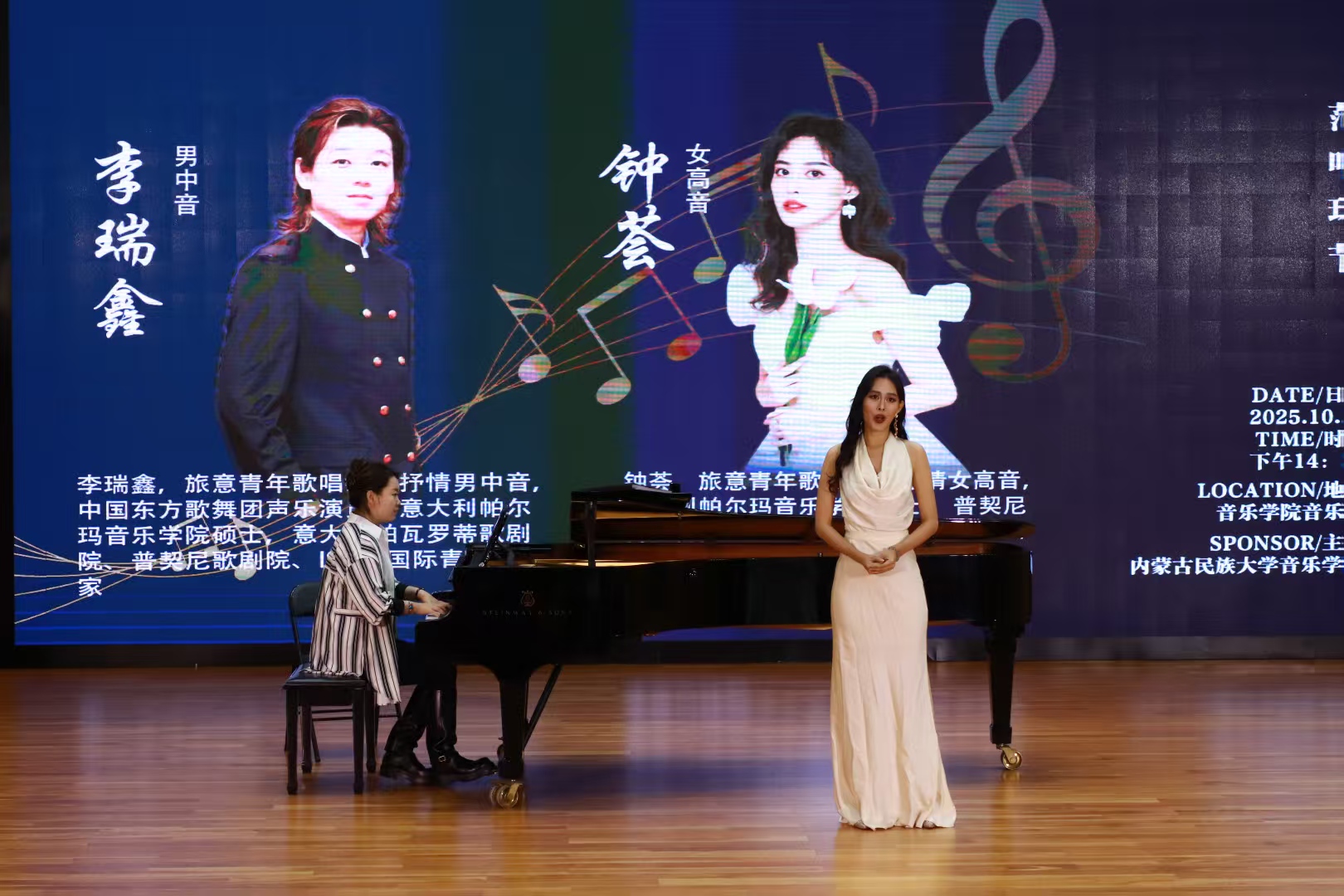 杨海源教授学生--旅意青年歌唱家李瑞鑫(抒情男中音,意大利帕尔玛音乐学院硕士,中国东方歌舞团声乐演员,曾入选ISING国际青年歌唱家培训计划)与钟荟(抒情女高音,意大利帕尔玛音乐学院硕士,普契尼歌剧院青年艺术家,2023年意大利普契尼音乐节特邀女高音)在讲座中先后登台,深情演绎5首经典声乐作品,其精湛的演唱技巧、饱满的情感表达,为在场师生提供了最直观的艺术示范。