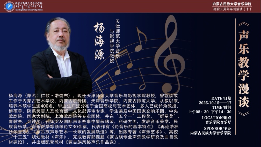 10月15日至17日,著名蒙古族男中音歌唱家、教育家,天津师范大学音乐与影视学院杨海源教授应邀莅临音乐学院,以“声乐教学漫谈”为主题开展为期三天的教学系列活动。