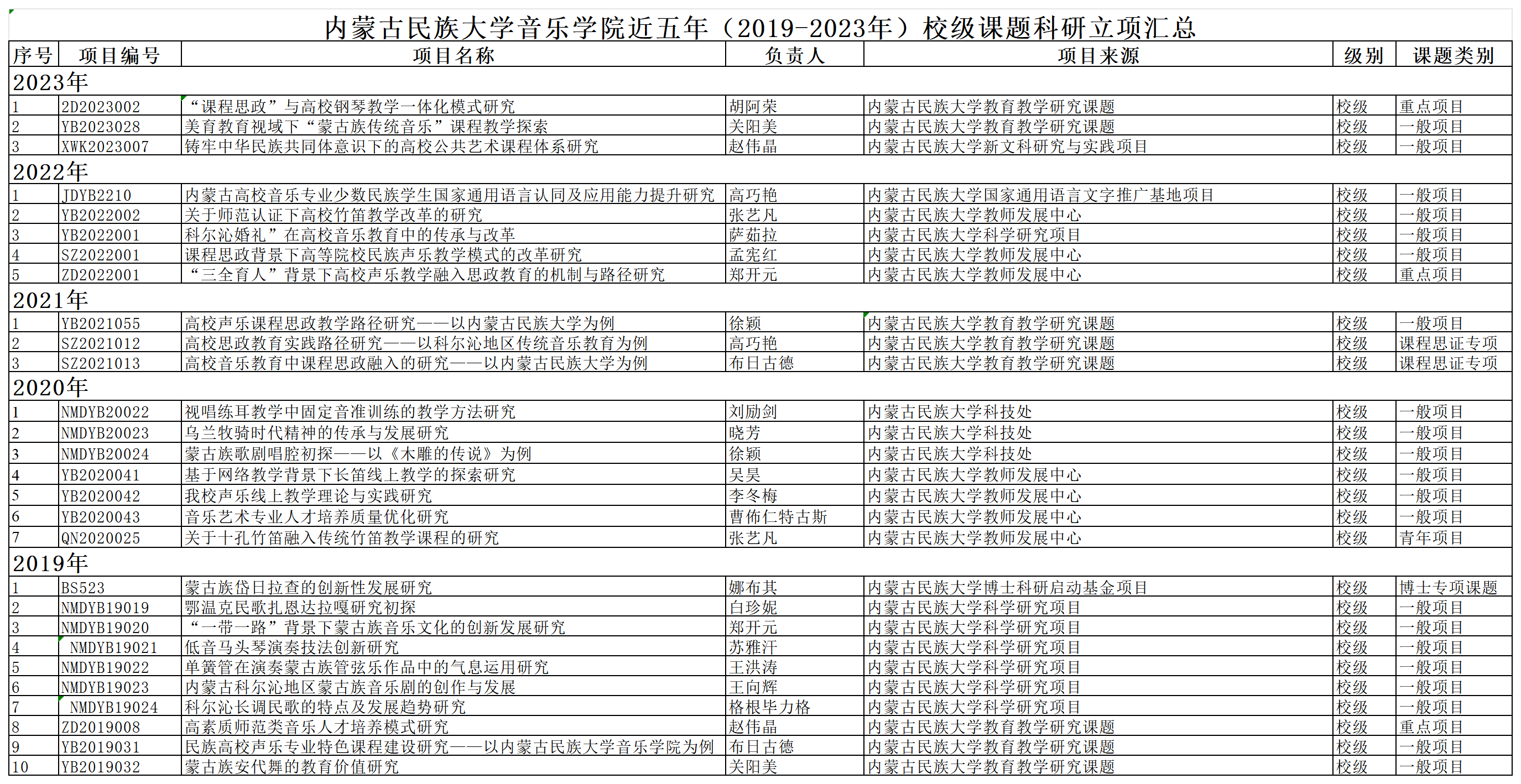 内蒙古民族大学音乐学院近五年(2019-2023年)校级课题科研立项汇总