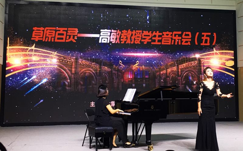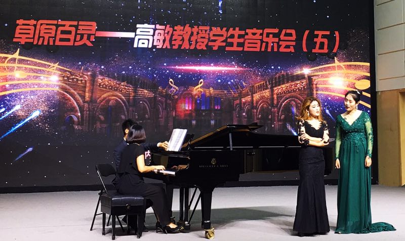2018年6月8日晚上7点半,在内蒙古民族大学音乐厅举办了"草原百灵——高敏教授学生音乐会"(五)。内蒙古民族大学音乐学院院长温泽、党总支副书记耿学刚与师生一同观看了本次演出。