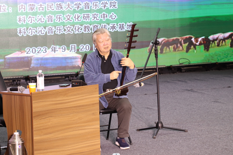 在专题讲座中,巴彦保力格教授通过生动的演奏示范,向现场观众展示了孙士四胡演奏法的独特韵味和演奏技巧。以灵活的指法和高超的音乐表达能力,将八音、乌力格尔、科尔沁民歌演绎得淋漓尽致,令人陶醉其中。讲座最后与现场观众进行了精彩的互动。