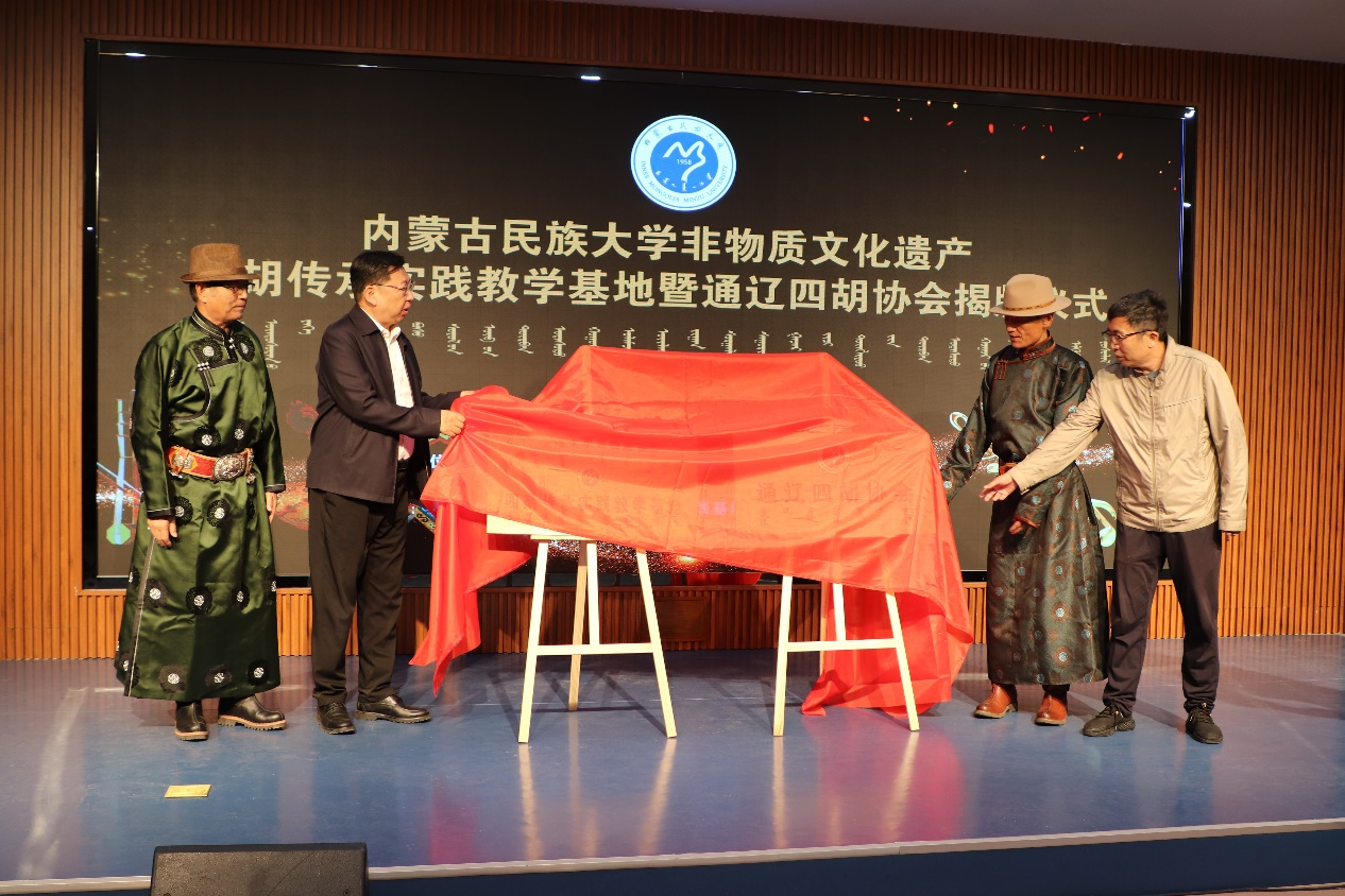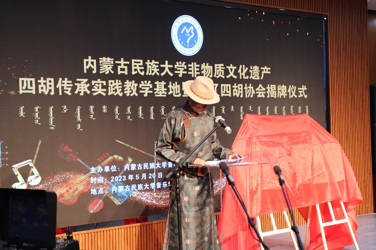5月20日上午10点,四胡传承实践教学基地暨通辽四胡协会揭牌仪式在内蒙古民族大学音乐学院艺术实践基地隆重举行,标志着蒙古族四胡文化事业迈上了一个新的台阶。校党委委员、统战部长王百涛、通辽市民委二级巡视员包根柱、通辽市文联主席苏日塔拉图、通辽市教体局美育中心主任七十八、通辽市广播电台文艺部主任张辉等嘉宾和音乐学院党总支书记曹佈仁、音乐学院院长温泽、党总支副书记耿学刚、副院长赵伟晶以及众多民间艺人参加了揭牌仪式。