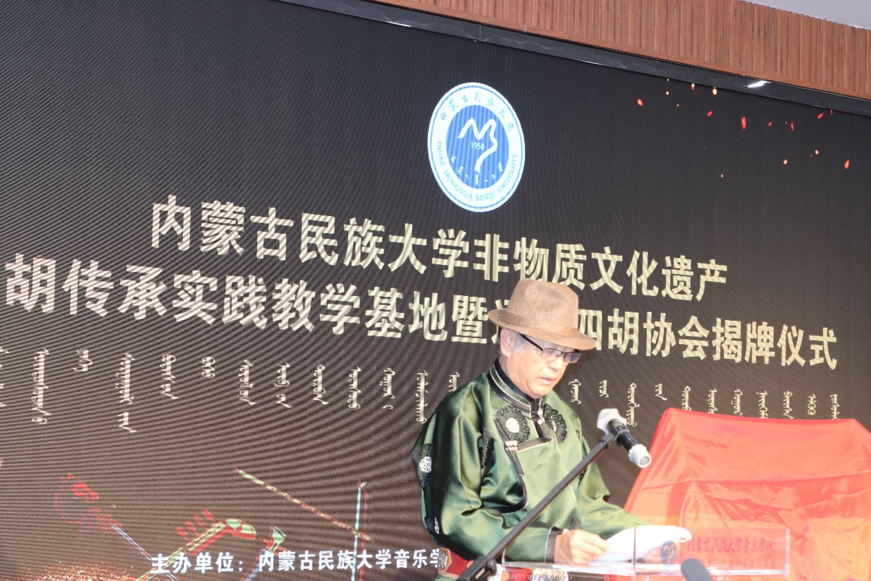 通辽市四胡协会主席努力玛扎布在致辞中表示,四胡协会将打造具有学术价值和科研价值的文化机构,以适应现代社会需求为发展理念,致力于推广和传承四胡音乐,以更好的保护弘扬和传承中华传统文化。内蒙古民族大学四胡传承基地得益于内蒙古民族大学音乐学院和通辽市四胡协会之间的深厚友谊,将对推动内蒙古民族传统音乐事业的发展起到积极作用。我们相信在内蒙古民族大学四胡音乐传承基地的支持和帮助下,将不断挖掘出新的四胡民族民间音乐的艺术魅力和文化内涵,让更多的人能够了解和喜爱传统的艺术形式。