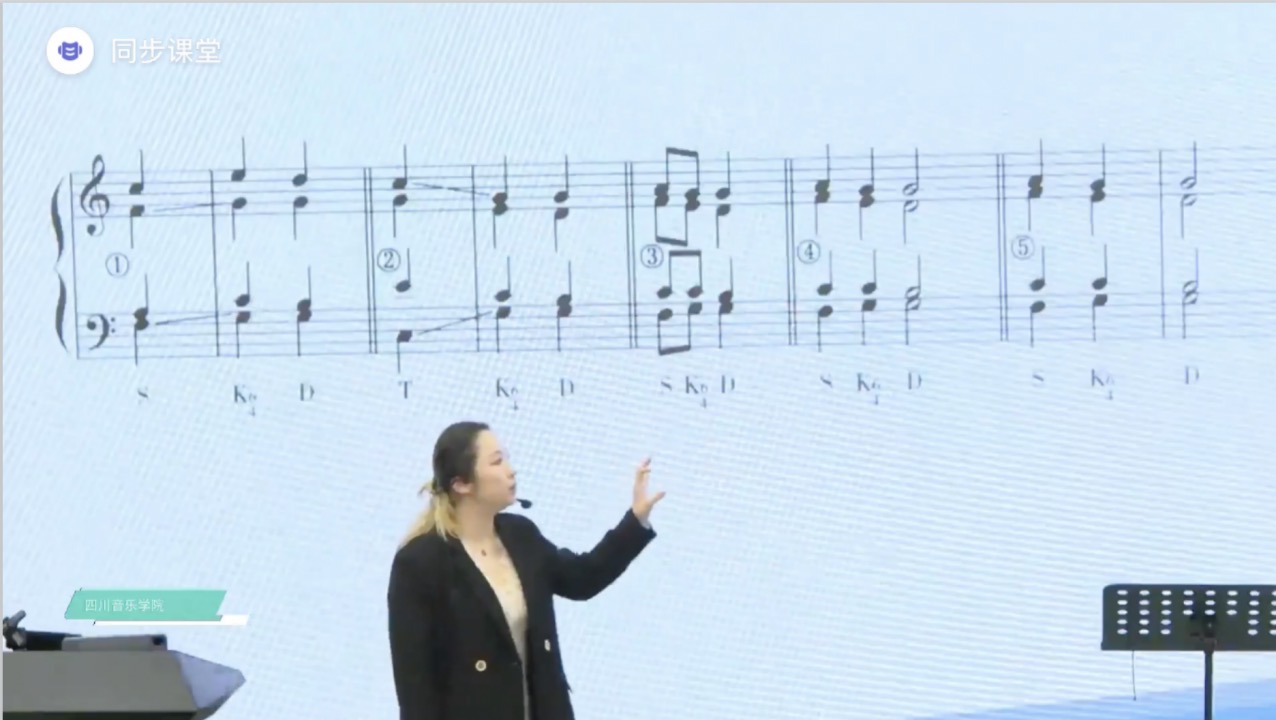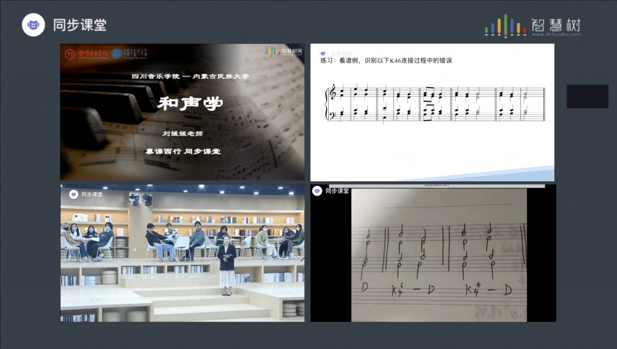 本次同步课堂的主题是终止四六和弦。刘媛媛老师将理论知识结合谱例呈现,内容讲解辅以实践练习,循序渐进、深入浅出。两校的同学们积极参与课堂的“云互动”,同步上课、同堂提问、同堂“头脑风暴”使学生的学习积极性、主动性和创造性得到充分发挥。