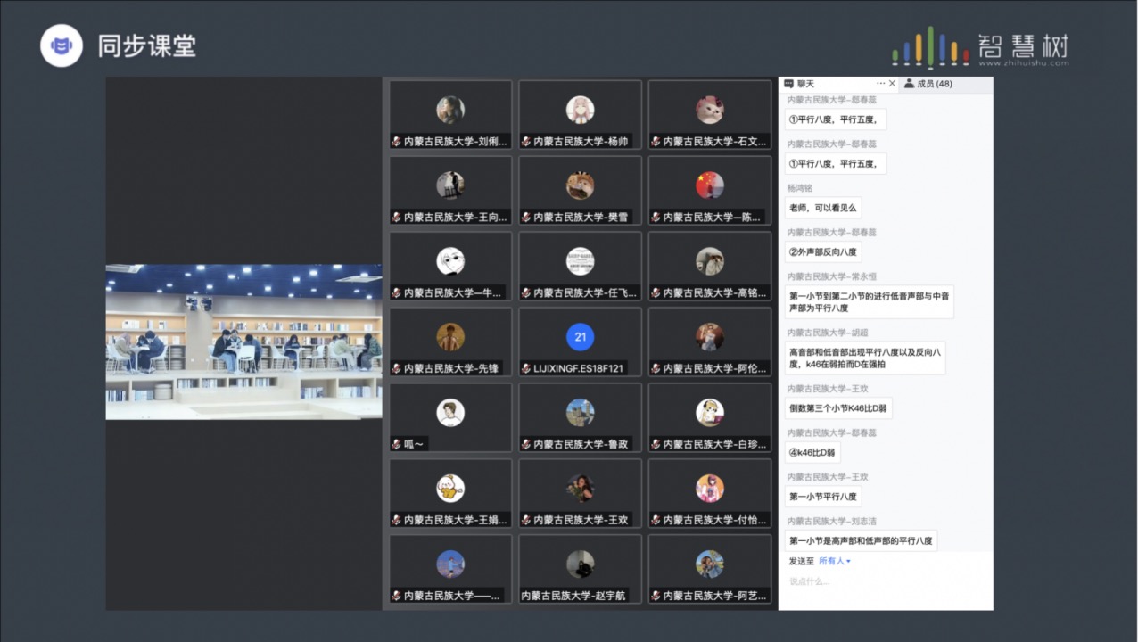 为积极响应教育部高教司“慕课西行”号召,深化教学改革的进一步实践探索,内蒙古民族大学音乐学院与四川音乐学院于11月16日上午运用“智慧树”线上教学平台,配合腾讯会议app,在线上开展了【和声学】课程的“慕课西行•同步课堂”活动。本次活动由四川音乐学院的刘媛媛老师主讲,内蒙古民族大学音乐学院2021级音乐学1班、2班全员同学与四川音乐学院2022级作曲系的同学同步上课。内蒙古民族大学音乐学院和声学主讲教师石垚负责本次活动的申请及组织协调工作,主管教学副院长赵伟晶、音乐教育系主任王向辉、教务办主任潘宇慧、该课程另一位主讲教师斯琴、其他音乐理论与音乐教育教研室部分教师、部分音乐学院研究生及智慧树平台工作人员参与了本次观摩活动。