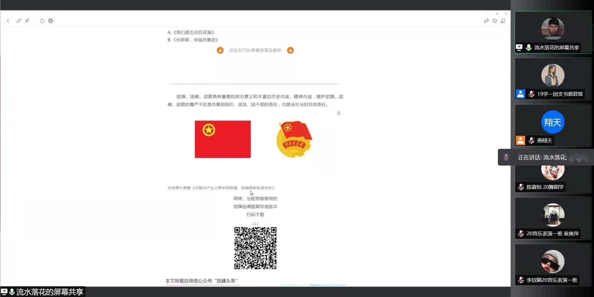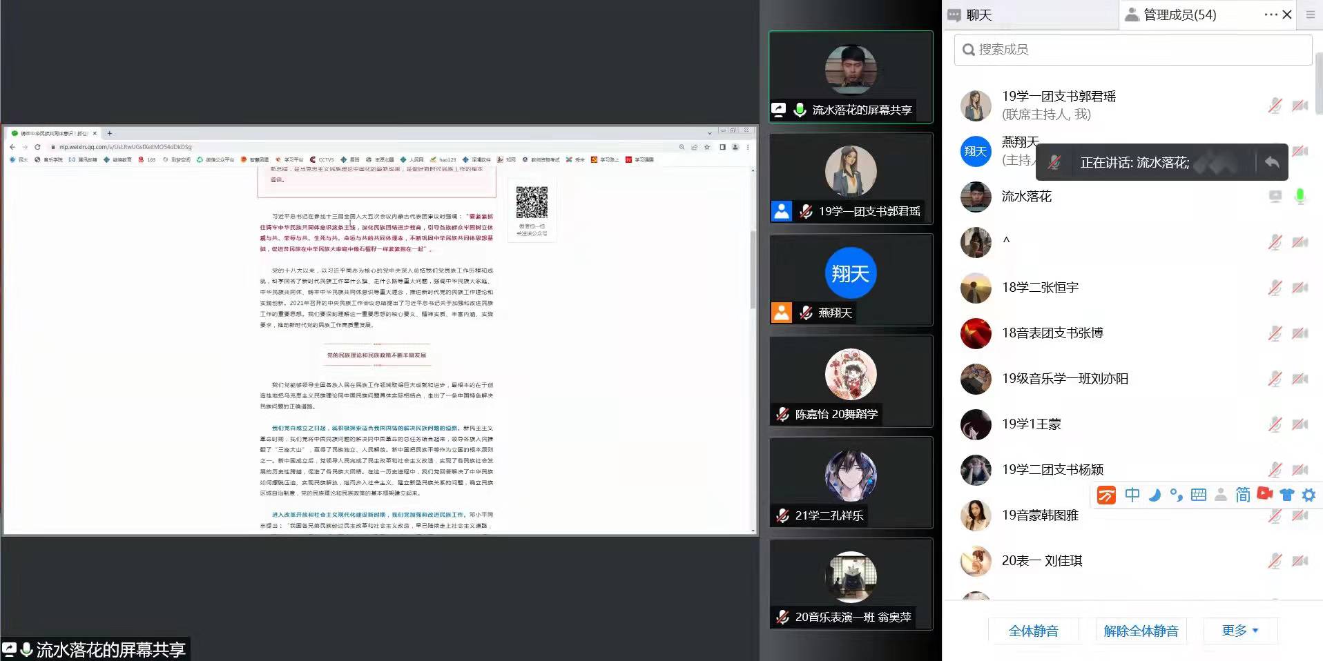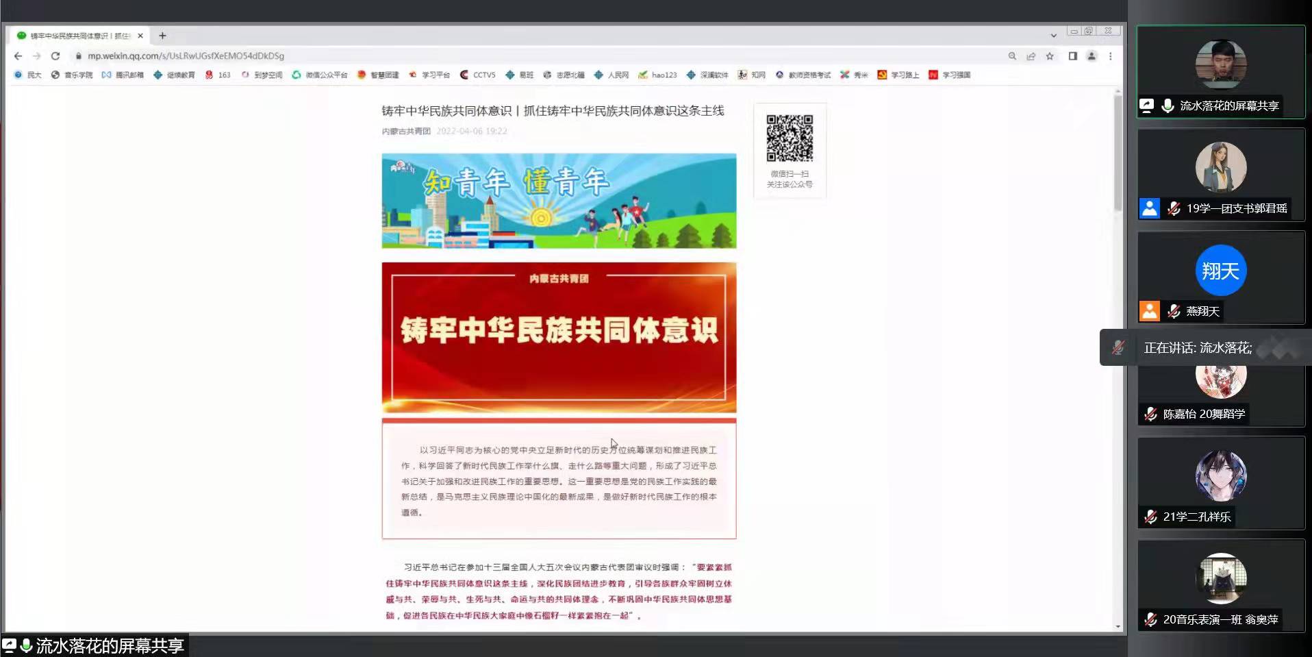 首先团总支副书记书记越鸣珂从意识形态工作的极端重要性入手,向同学们强调线上上课期间要重视自觉学习,要主动关心自身和他人心理变化,不参与不实言论,不发表不负责任的言论,要对意识形态工作有自主的敏感性。同时作为学生干部要自觉推广使用国家通用语言文字、奉行使用国家统编教材政策要求,要学好、用好国家通用语言文字,让自己更适应时代发展的要求。接着越鸣珂与大家共同学习中国社会科学院民族学与人类学研究所研究员王希恩老师发表的《铸牢中华民族共同体意识丨抓住铸牢中华民族共同体意识这条主线》全文内容。