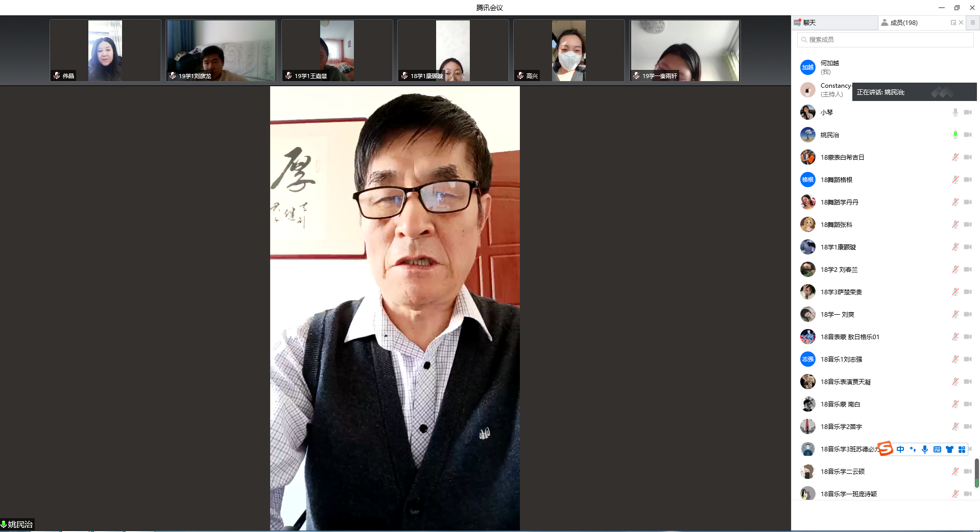 2月25日下午,音乐学院邀请内蒙古民族大学姚民治教授为学院2018级、2019级音乐学专业实习生开展第一次线上实习前培训课程,学院教学院长赵伟晶教授参加培训。本场课程主题为帮助学生做好实习前的准备工作、解决实习期间将遇到的问题等,课程共187名学生参加。