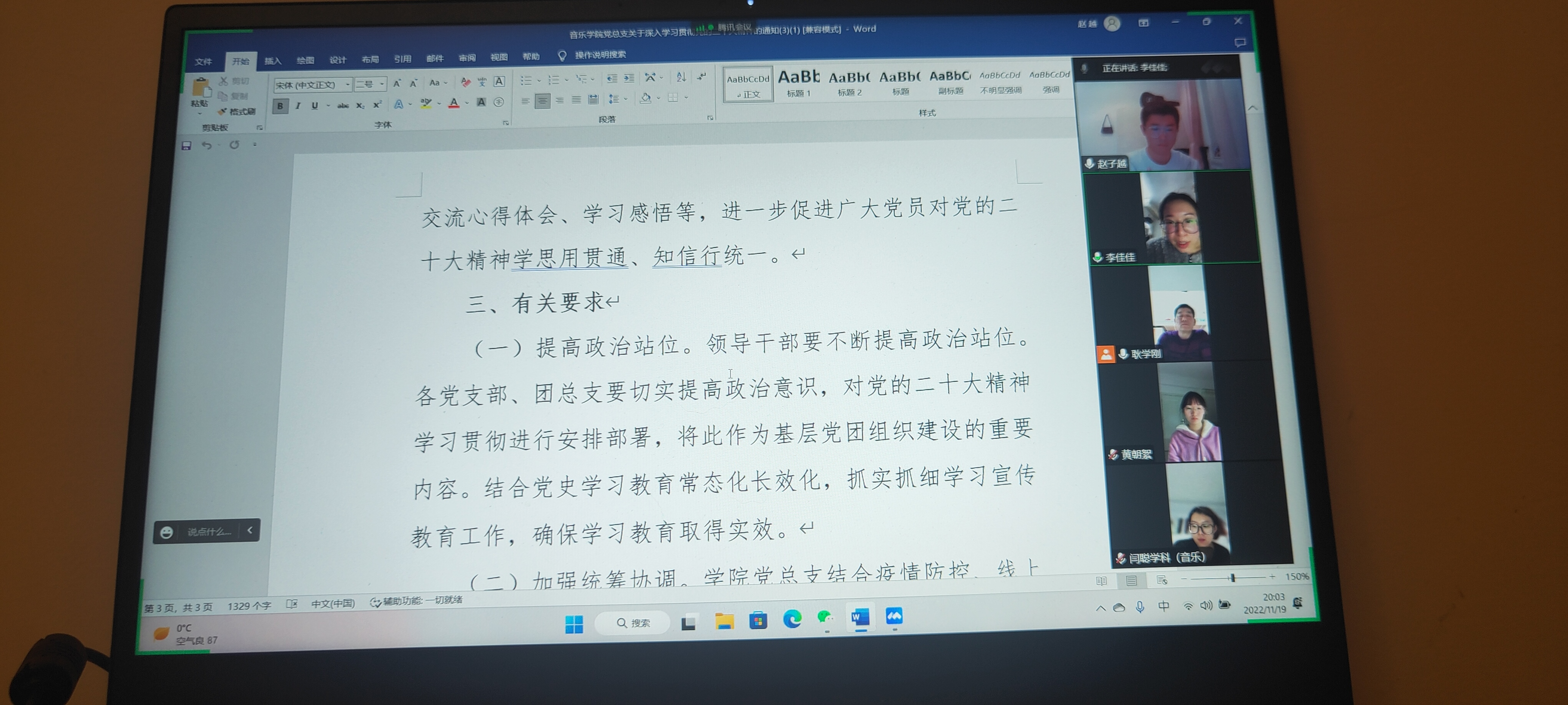 会议探讨了党小组成员任务分工的问题、确定下次党小组活动的主题、深入研读《音乐学院党总支关于深入学习贯彻党的二十大精神的通知》。耿书记强调,要深入学习贯彻党的二十大相关内容以及熟读中国共产党章程,提高党员同志思想政治觉悟。会议明确研究生党员同志务必要做好充足的理论储备,加强对党组织理论知识的学习,以便将来能及时解答同学们提出的有关党组织的相关理论问题,牢固树立为人民服务的宗旨,使自己能在本科生以及研究生中起到表率作用。