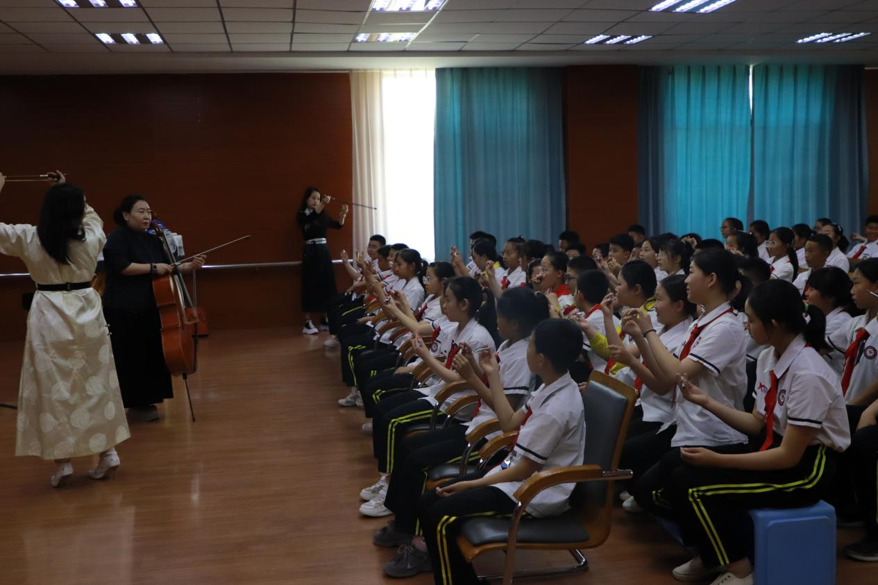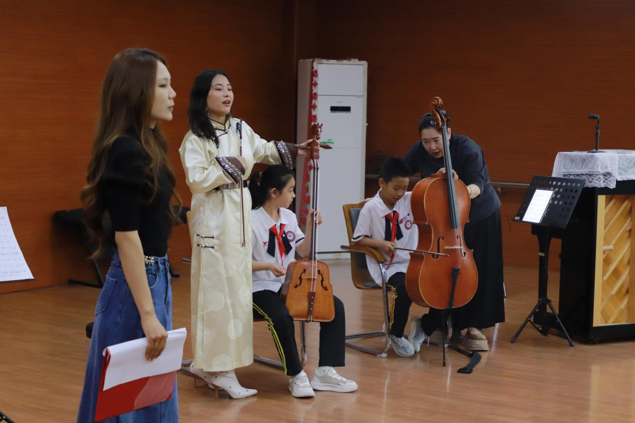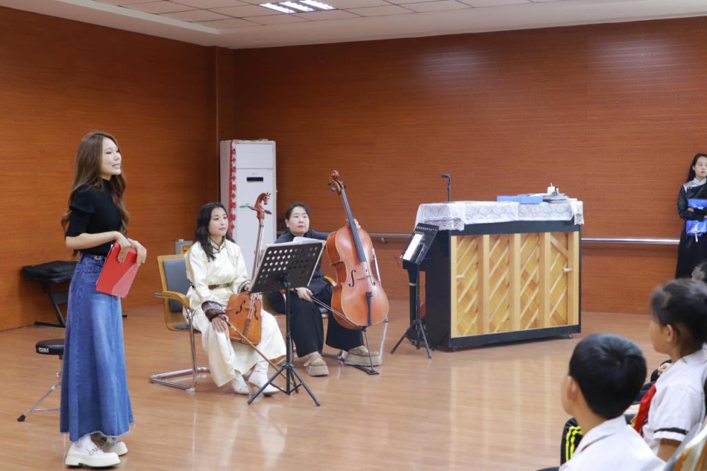 为深化音乐教育专业研究生实践教学能力培养,推动多元文化在中小学音乐课堂的融合创新,2025年5月27日,由内蒙古民族大学音乐学院娜布其老师指导的“音乐教学设计与实施”课程团队,在通辽市新城一中开展 “弦乐双生 —— 大提琴与马头琴的中西方音乐对话” 主题教学实践活动。此次活动依托音乐学院专业师资与乐器资源,针对边疆地区音乐教育资源分布不均、专业乐器现场实践教学不足的痛点,通过跨文化音乐对话的创新形式,为新城一中105 名五年级学生带来了一次深刻的音乐文化沉浸体验。