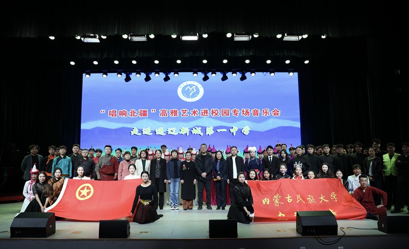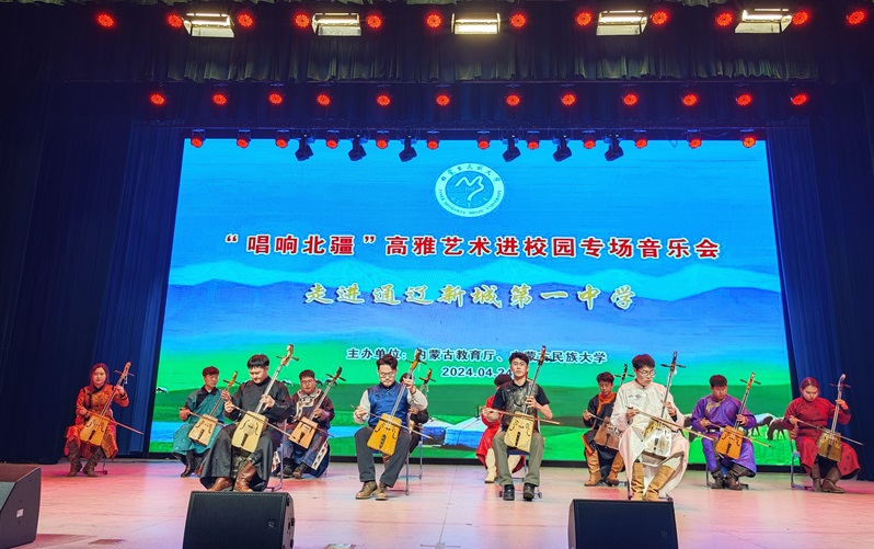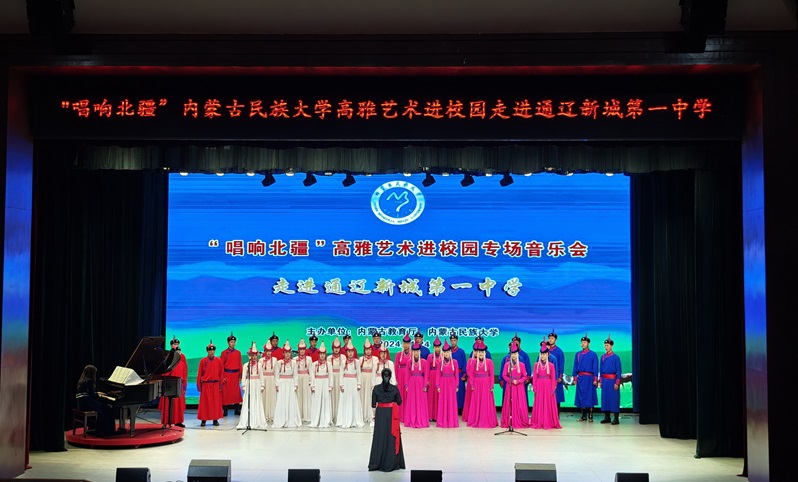 为了提升学生的艺术素养,丰富校园文化生活,促进高雅艺术在校园内的传播与普及,2024年4月24日下午,“唱响北疆”高雅艺术进校园专场音乐会在通辽新城第一中学成功举办。音乐学院党委副书记董辉、表演系主任包那日苏、团总支负责人陈琢带领内蒙古民族大学乌兰牧骑师生、青年志愿者协会同学参与演出。