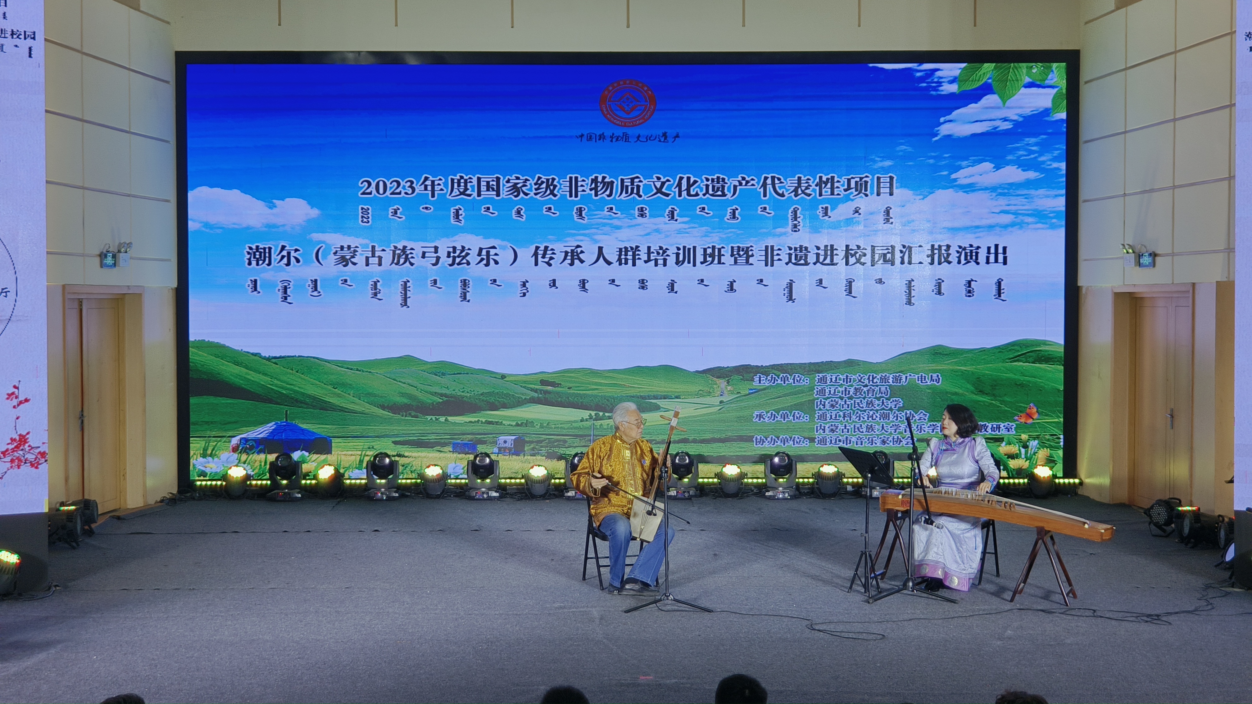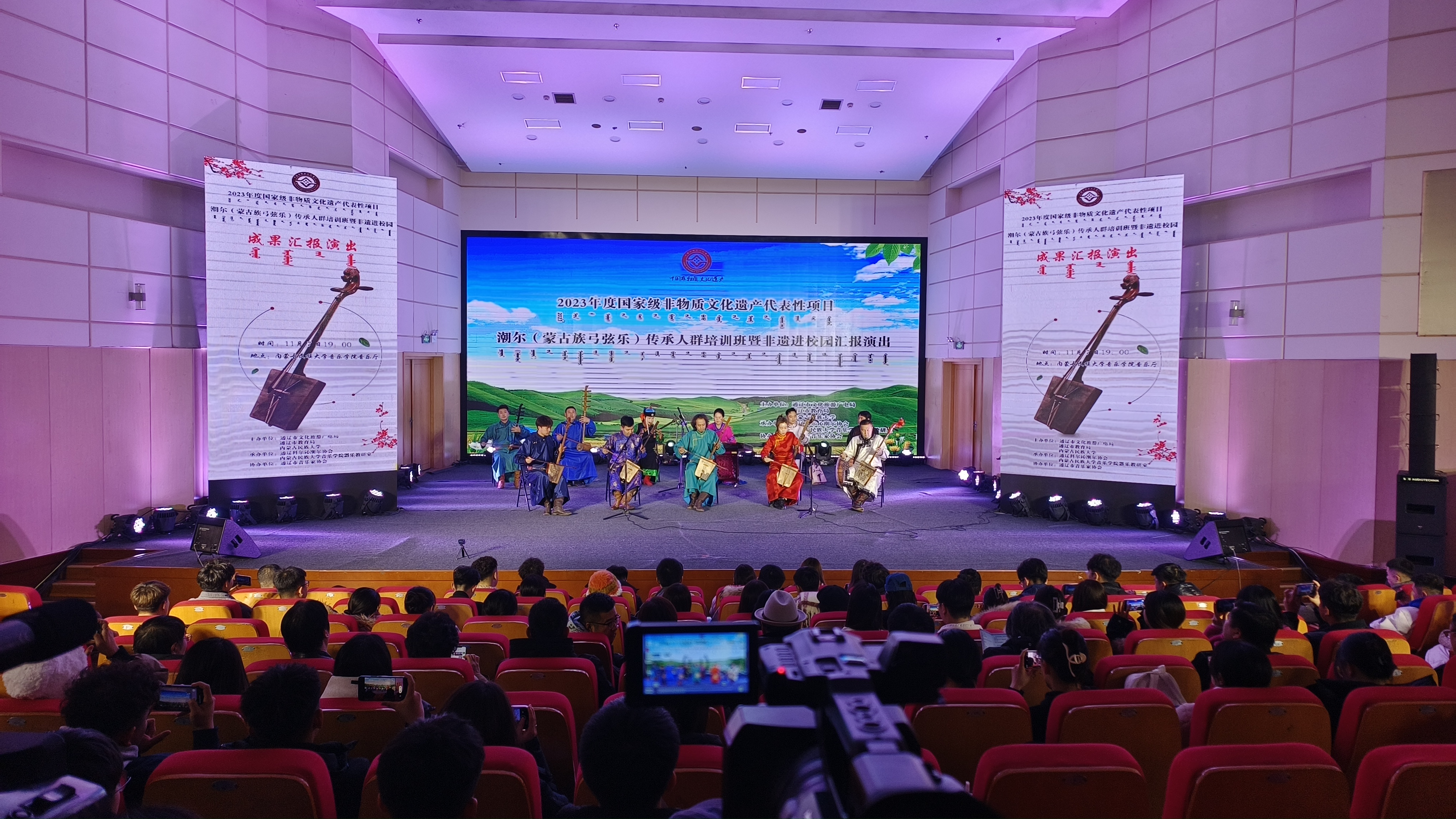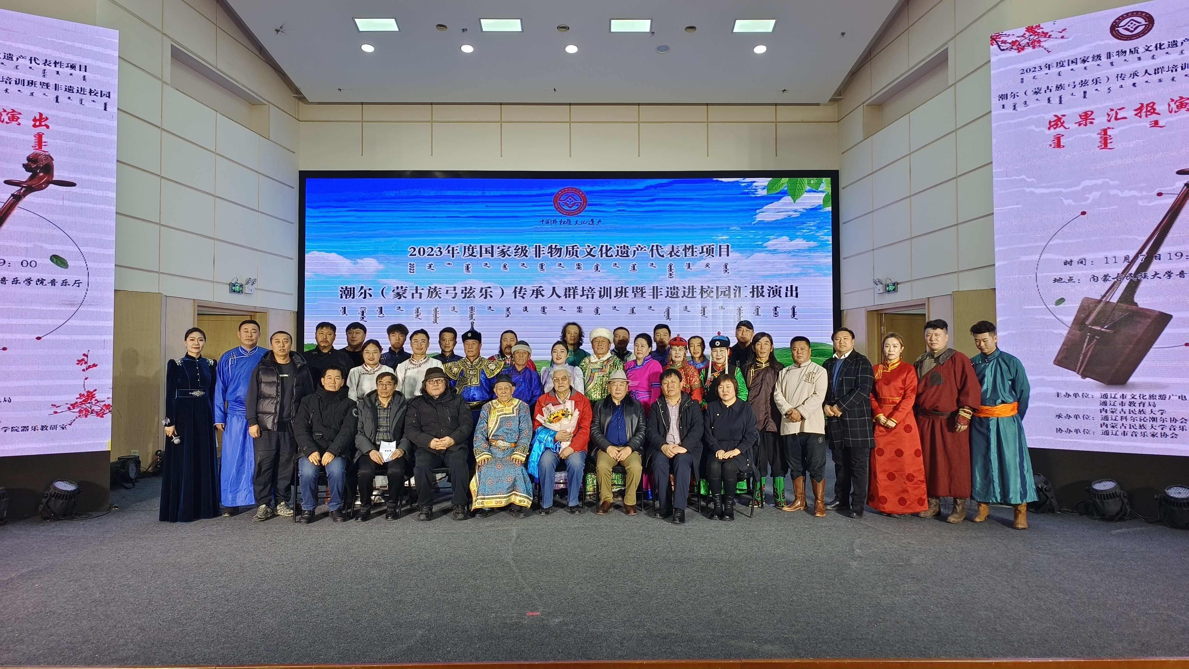 贯彻落实习近平总书记考察内蒙古时作出的重要指示要求,以铸牢中华民族共同体意识为主线,不断巩固各族人民对伟大祖国的认同、对中华民族的认同、对中国特色社会主义道路的认同,为进一步提高非物质文化遗产传承人传承实践能力,促进非遗可持续传承发展,由通辽市文旅广电局、通辽市教育局、内蒙古民族大学主办,通辽科尔沁潮尔协会、内蒙古民族大学音乐学院器乐教研室承办,通辽市音乐家协会协办的2023年度国家级非物质文化遗产代表性项目潮尔(蒙古族弓弦乐)传承人培训班汇报演出暨非遗进校园活动出于11月7日晚19点在内蒙古民族大学音乐学院音乐厅隆重举行。