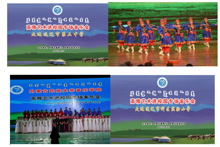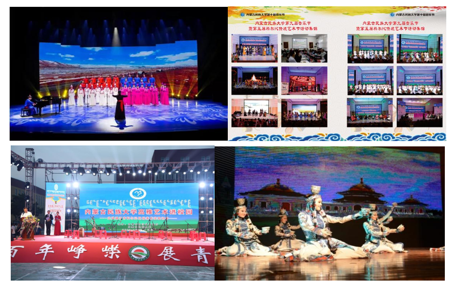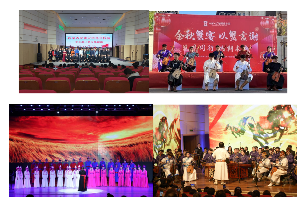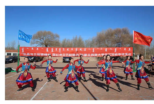 内蒙古民族大学乌兰牧骑自2018年成立以来,坚持以美铸魂、以美养德、以美育智,充分利用音乐学院自身教学资源,发挥师生专业特长,在校内举行“守望相助,携手同行”等专场演出,加强校园文化建设和优秀传统文化走进校园活动,打造文化浸润、文化感染、文化熏陶的良好育人环境;在广大农村牧区举行“同唱丰收曲,共筑中国梦”等专场演出,扎根农牧区,服务群众,以创作接地气、传得开、留得下的好作品为宗旨,助力新时代自治区文艺创新。