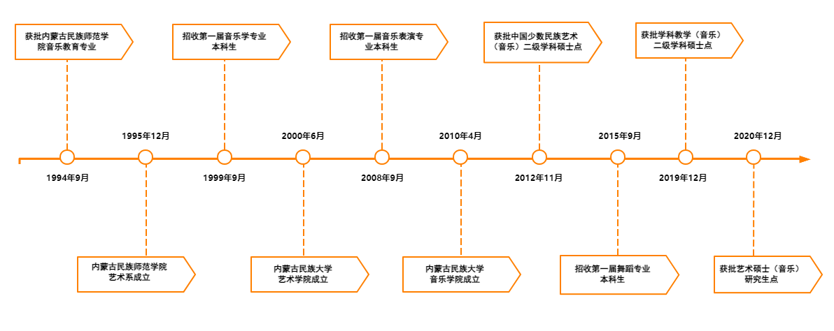 内蒙古民族大学音乐学院秉承“飞行的音符1234”人才培养理念,即一个应用、两个精神、三个专业、四个平台,立足北疆,面向全国,以美育人、以艺促教,培养高素质应用型音乐人才。现有音乐学(师范类)、音乐表演、舞蹈学三个本科专业;中国少数民族艺术、学科教学(音乐)、艺术三个学科硕士点。坚持“特色办学、务实办学、开放办学、创新办学”理念,立足北疆,突出特色,打造品牌,注重与国内外知名院校合作办学和学术交流,办学规模、办学条件、办学层次、办学质量逐年提升,为完成习近平总书记交给内蒙古的五大任务、全方面建设模范自治区的“两件大事”提供艺术人才支撑。