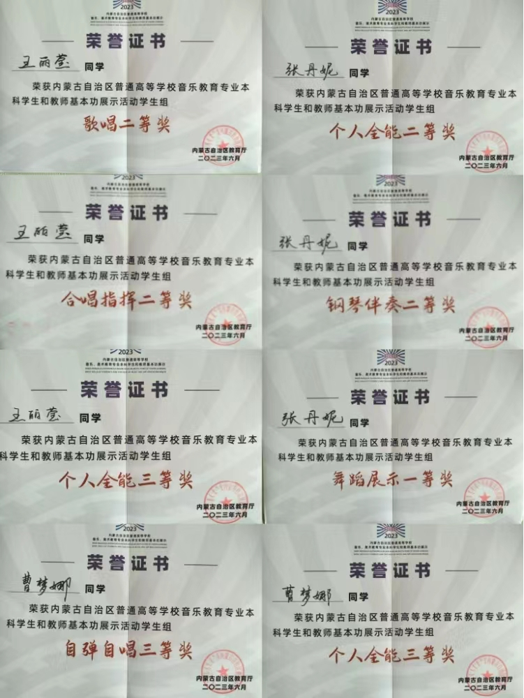 音乐学院坚持“学生中心、产出导向、持续改进”等质量管理理念,从理论到实践逐步完善教学质量。近年来,获得省部级及以上教研教改项目24项;自治区级精品课程1项;获教育部普通高等学校音乐教育专业本科教师基本功大赛自治区奖17项;校级“示范课教学奖”、“教学技能奖”、“教师教学创新奖”“微课教学设计奖”“课程思政教学设计奖”等教学奖6项;校级教学成果奖1项;获批人文社科类项目56项,其中获省部级项目46项,获内蒙古自治区教育科学研究“十四五”规划课题7项;获内蒙古自治区教育科学研究“十三五”规划课题2项;出版学术专著6部;发表论文41篇,其中核心论文5篇;授权专利1项。