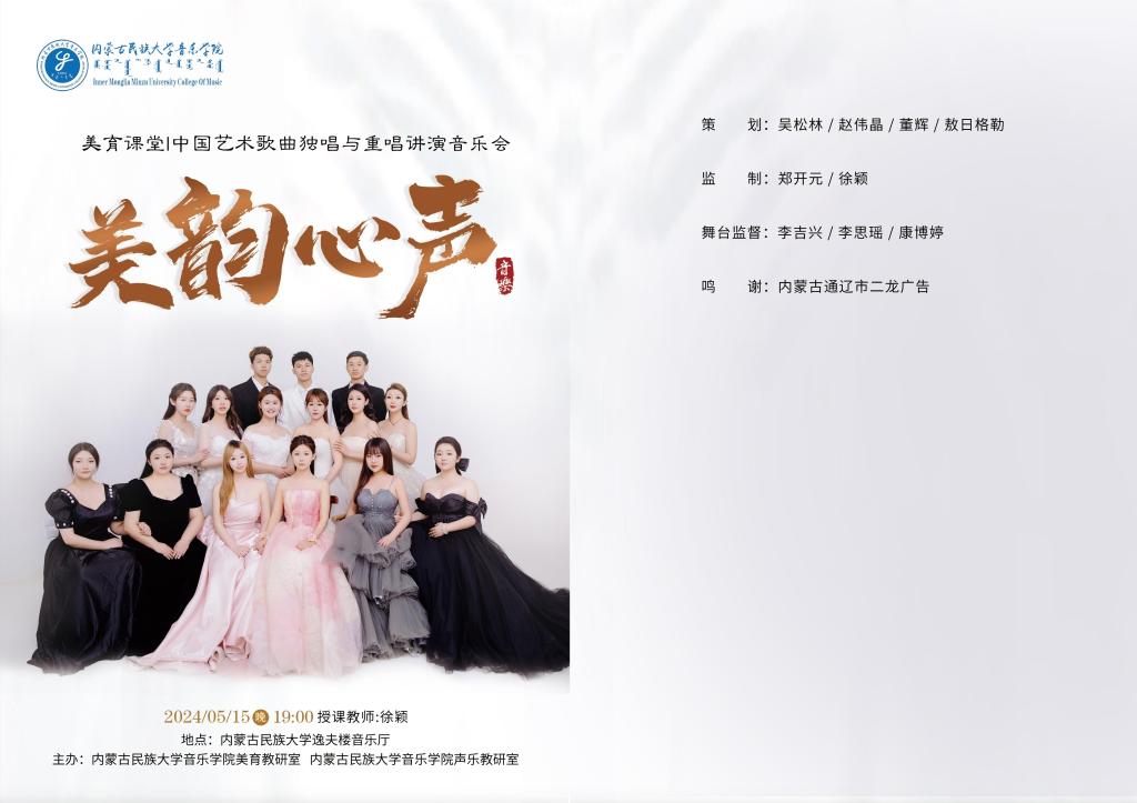 2024年5月15日晚,中国艺术歌曲独唱与重唱讲演音乐会“美韵心声”于逸夫楼音乐厅成功举办。本场音乐会由内蒙古民族大学音乐学院声乐教研室、音乐学院团总支、美育教研室主办。音乐学院领导、老师及全校350余名学生观看音乐会。