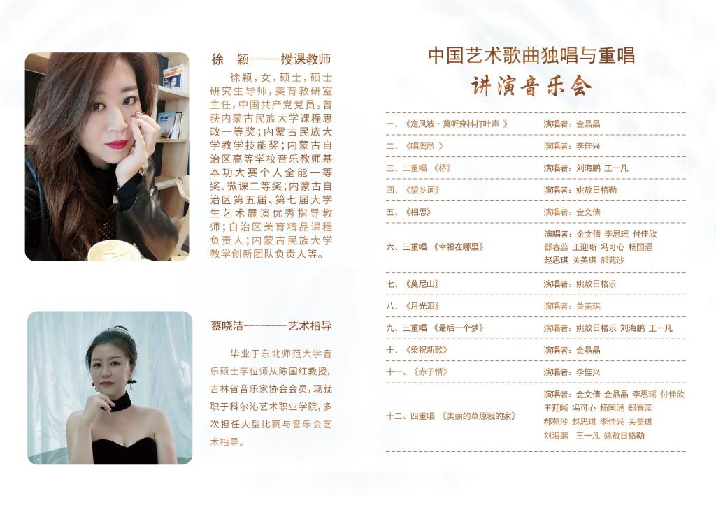 这场演出,由音乐学院徐颖老师带领她的学生筹备表演,选唱了8首独唱与4首重唱的中国艺术歌曲。表演者们以深情的歌声,诠释着对每一首中国艺术歌曲内涵与情感的表达。这是一场探索中国传统文化精髓,以中国艺术歌曲为媒介并以讲演的形式,展示中华音乐独特魅力的音乐会。旨在让观众走进美育课堂,在音乐中感受中国艺术歌曲的魅力。