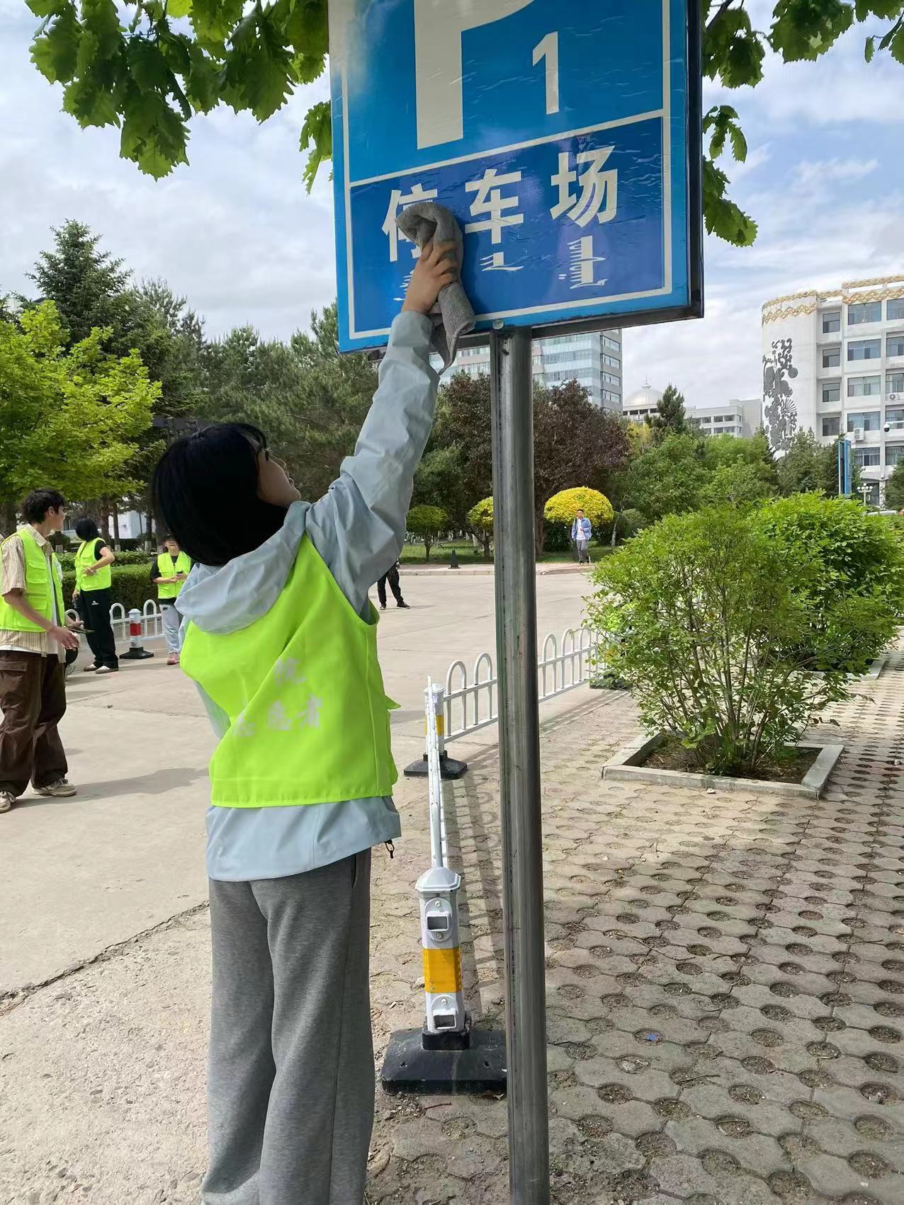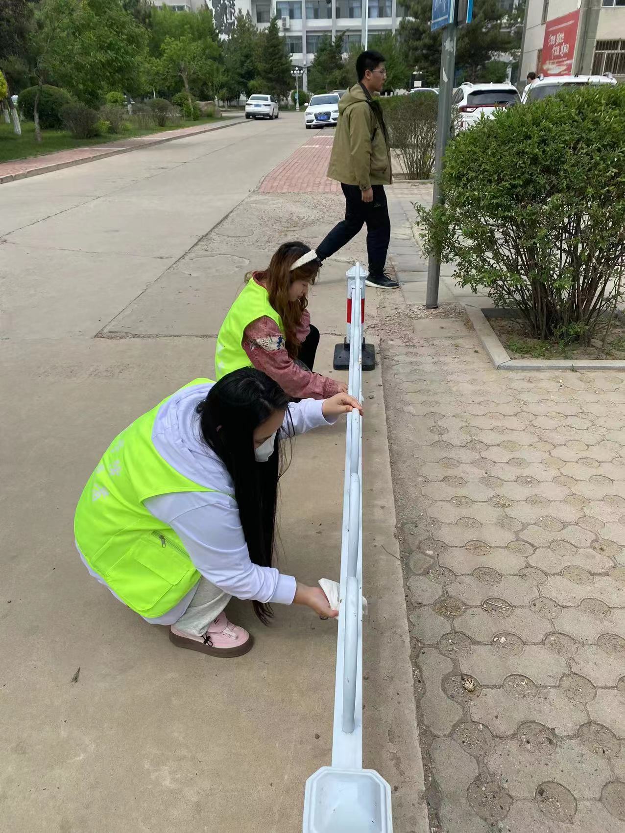 活动过程中,志愿者们分为若干小组,在负责人赵琪的带领下,有序开展对停车场栏杆、停车牌以及告示牌的清扫工作。停车场内涌动着志愿者们忙碌的身影,活动当天的风并没有吹走志愿者们对劳动的热爱,大家仍兴致勃勃的挥洒着汗水。