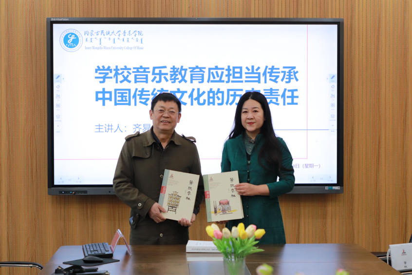 在讲座开始前,齐易教授向音乐学院赠送了具有特殊意义的礼物——本人编撰的非遗相关著作,表达了对学院音乐教育事业发展的美好祝愿。这一举动不仅为讲座增添了温馨的氛围,也展现了齐教授对音乐教育事业的深厚情感。