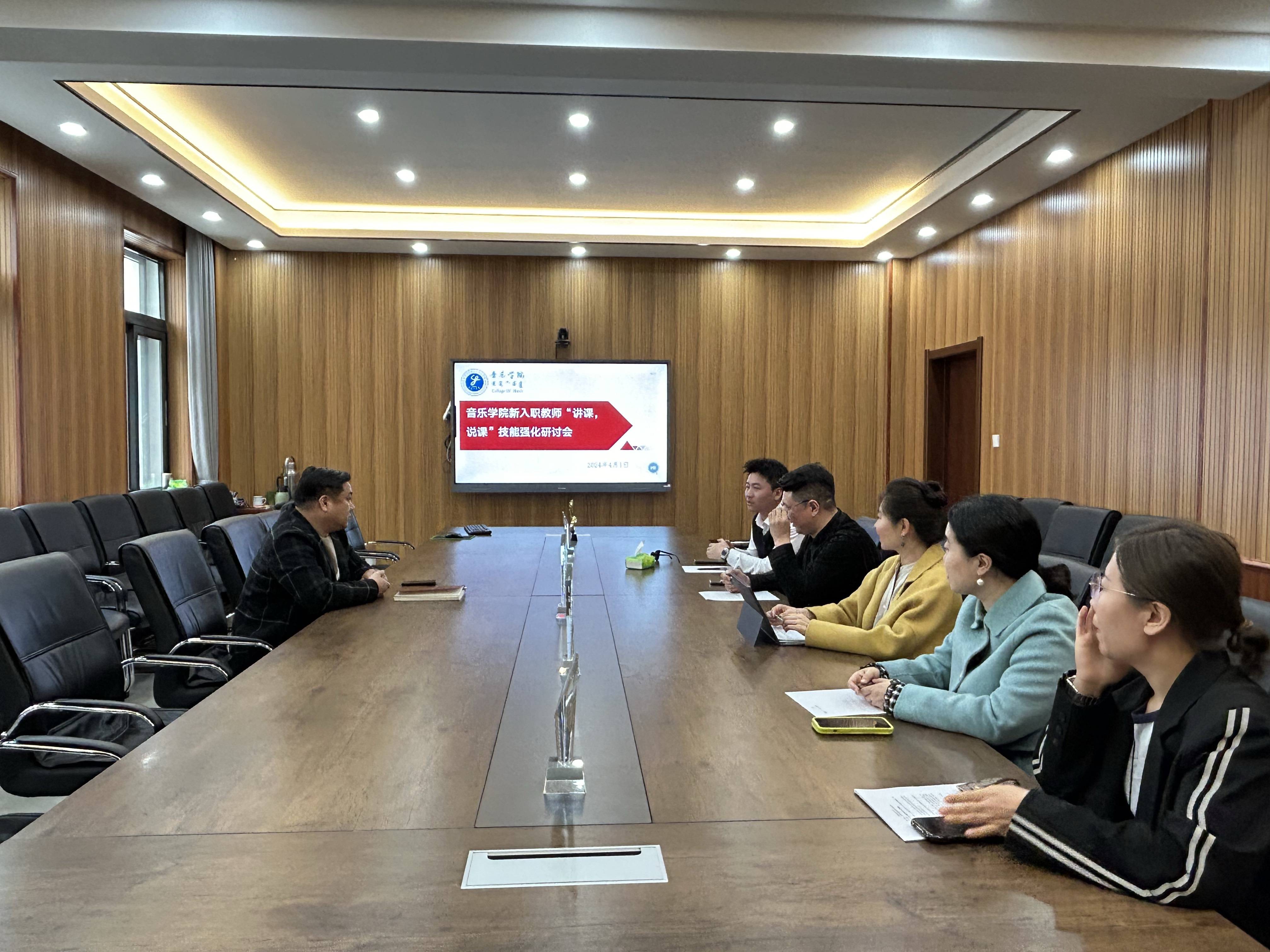 2024年4月1日,音乐学院逸夫楼229会议室组织召开新入职教师“讲课、说课”技能强化研讨会。音乐学院副院长敖日格乐和2023年新入职教师参加研讨会。